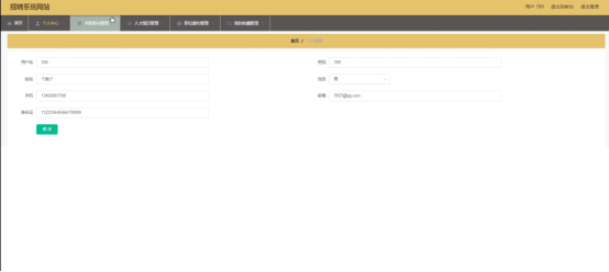 个人中心,在个人中心页面可以填写用户名、密码、姓名、性别、手机、邮箱、身份证等信息进行修改操作,如图5-7所示。