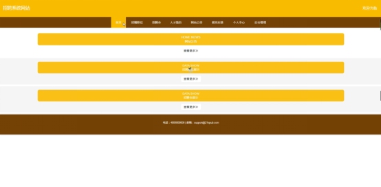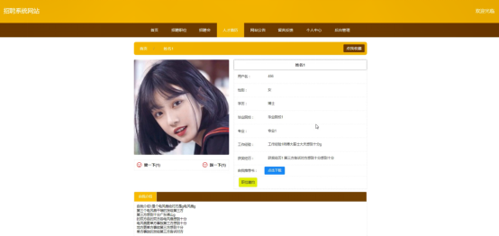 用户在首页上会看到各类模块的推送内容,可以以最直接的方式获取信息,注册登陆后,可以对应心仪的招聘进行选择,并且在后台可以管理自己的首页、个人中心、求职意向管理、人才简历管理、职位邀约管理、我的收藏管理等。而管理员则可以在后台直接管理和处理相关信息。本网站模块设计的独立性强,用户体验良好、后期维护修改管理十分方便。