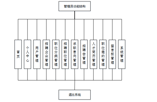 - 管理员功能模块包括:首页、个人中心、用户管理、招聘企业管理、职位分类管理、招聘职位管理、求职意向管理、招聘会管理、人才简历管理、职位邀约管理、留言板管理、系统管理模块。