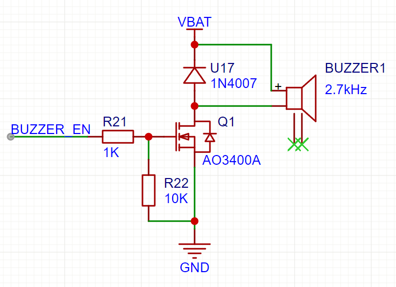 VBAT → U17 → BUZZER → Q1 漏极 → Q1 源极 → GND - 蜂鸣器得电 → 发出 2.7kHz 声音