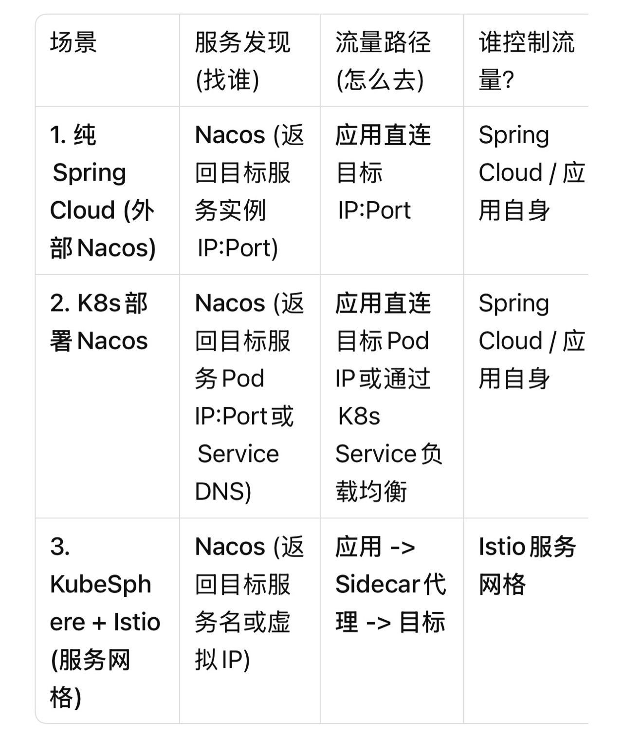 - 服务发现的作用:此时,Nacos的作用更多是作为一个服务注册中心,保证应用启动和健康检查。在严格模式下,网格内的服务通信甚至可以不依赖Nacos的发现结果,而是直接使用Istio内置的服务发现。