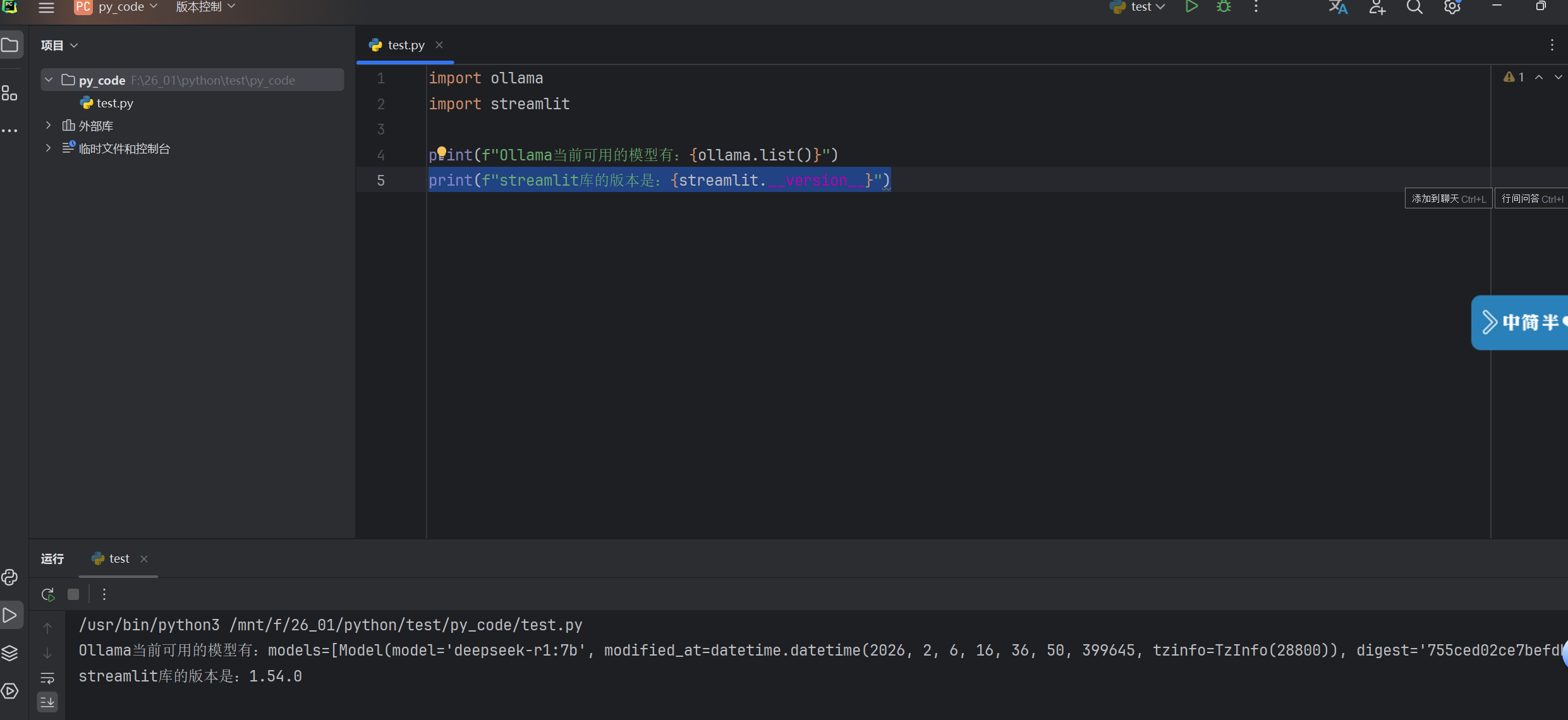 import ollama import streamlit print(f"Ollama当前可用的模型有:{ollama.list()}") print(f"streamlit库的版本是:{streamlit.__version__}")