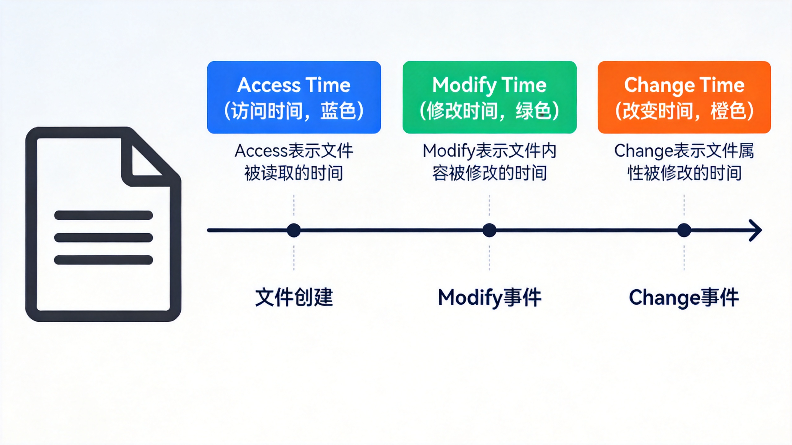 有趣的是,Modify Time的更新会伴随Change Time的更新。这是因为文件内容的改变通常会导致文件大小等属性的变化,所以Change Time也会随之更新。但反过来不成立------单纯修改属性(如权限)只会更新Change Time,不会影响Modify Time。