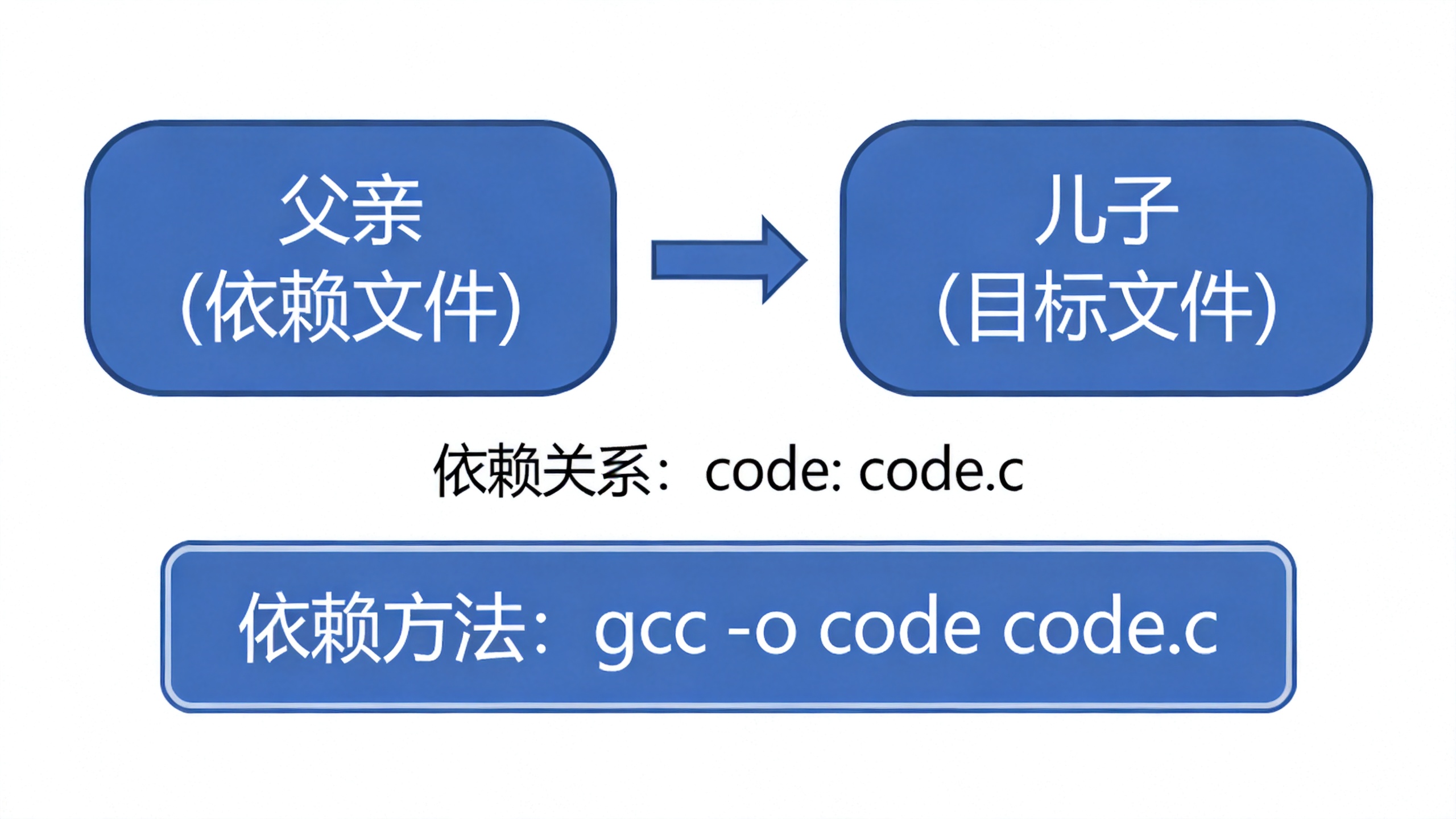 这里,code是目标文件,code.c是依赖文件,gcc -o code code.c是依赖方法。这条规则的含义是:要生成code,需要依赖code.c,通过执行gcc命令来完成编译。