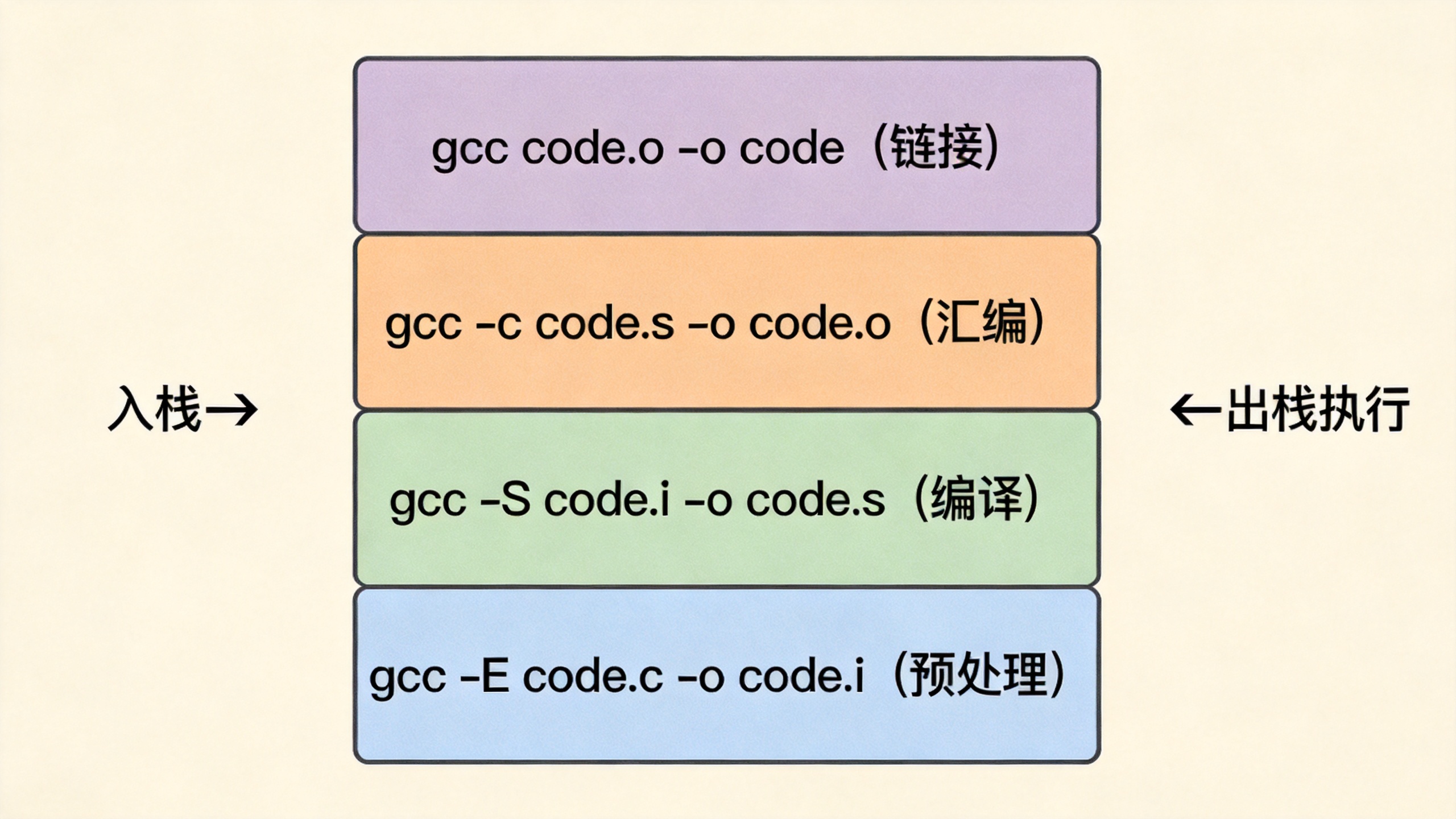 make发现需要生成code,但依赖的code.o不存在,于是将gcc code.o -o code这条命令入栈make继续查找如何生成code.o,发现它依赖于code.s,但code.s也不存在,于是将gcc -c code.s -o code.o入栈make继续查找如何生成code.s,发现它依赖于code.i,但code.i也不存在,于是将gcc -S code.i -o code.s入栈make继续查找如何生成code.i,发现它依赖于code.c,而code.c确实存在!