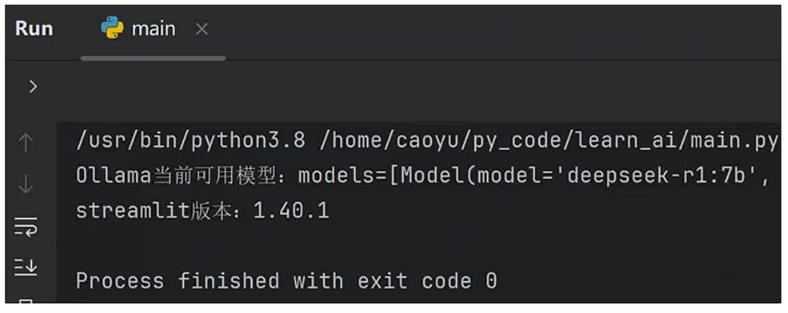 print(f"Ollama当前可用模型:{ollama.list()}")print(f"streamlit版本:{streamlit.__version__}")