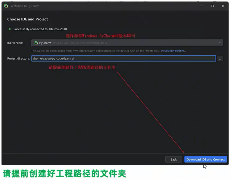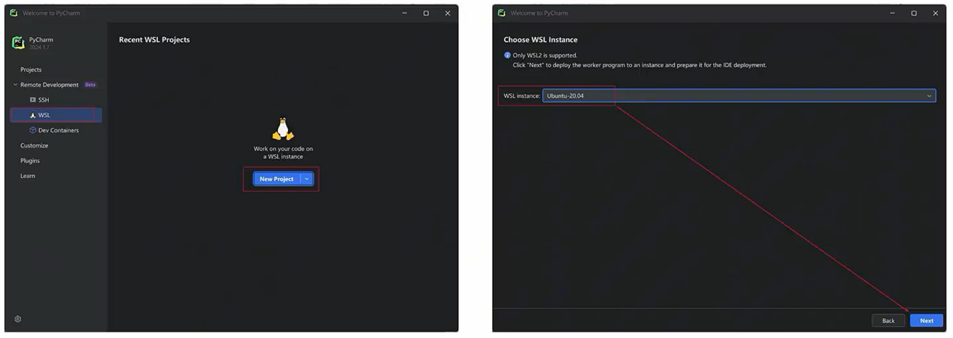 - 选择在WSL部署的PyCharm版本,以及选择工程路径