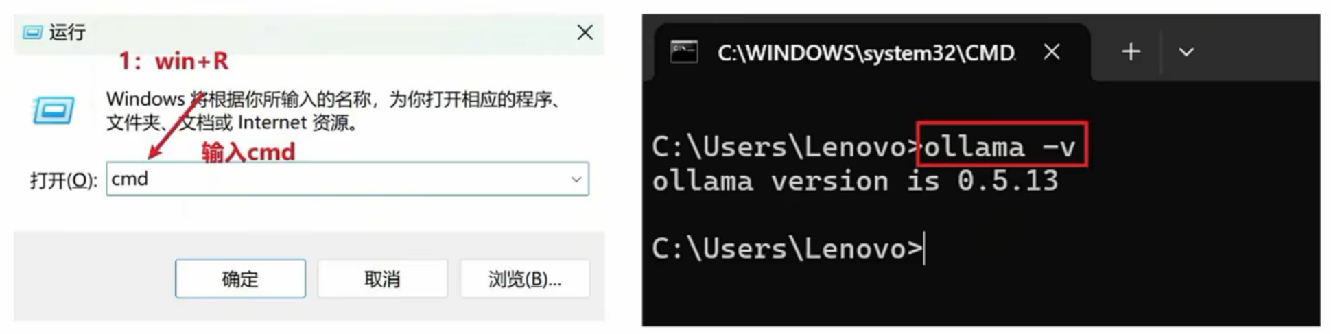 - win+R打开终端,输入ollama -v命令查看是否安装成功