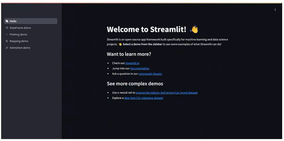- Streamlit自带了一个示例程序,我们可以执行: streamlit hello