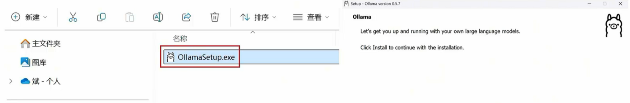 - 双击提前下载好的OllamaSetup.exe安装包,选择install,然后一直默认安装即可