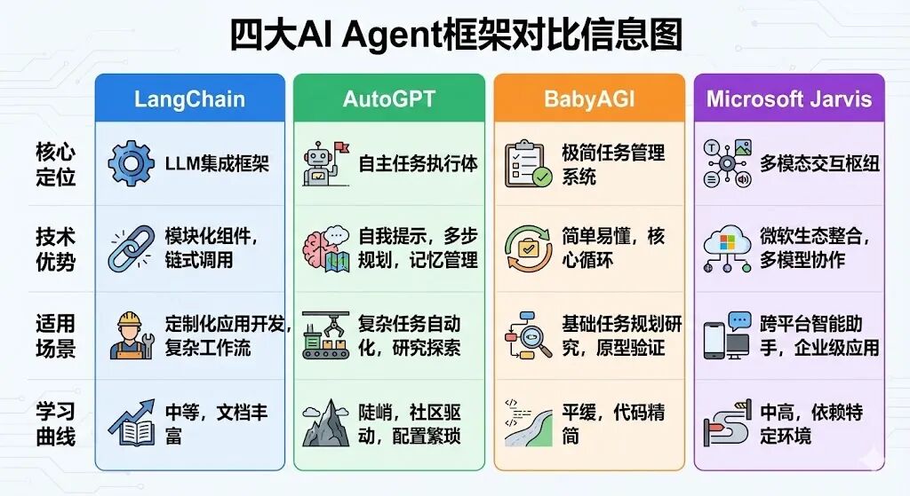 AI Agent框架的核心价值,在于将LLM的通用能力转化为可落地的业务解决方案,通过"大脑-双手-记忆-中枢"的协同设计,打破模型原生局限。LangChain、LlamaIndex、Qwen-Agent、AutoGen四大框架各有侧重,开发者需立足业务场景,平衡开发效率、性能与扩展性选型。