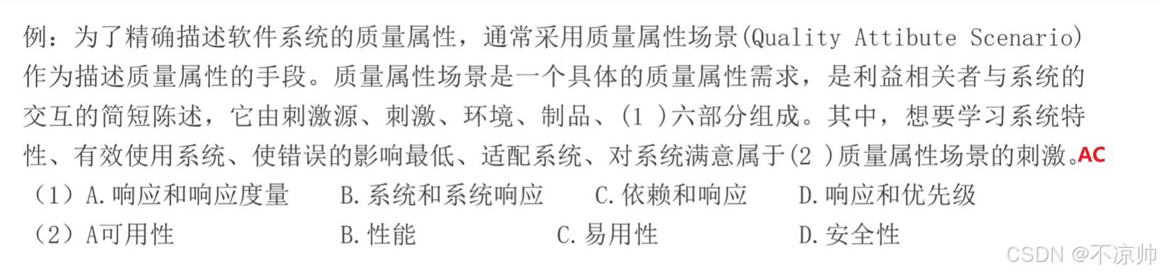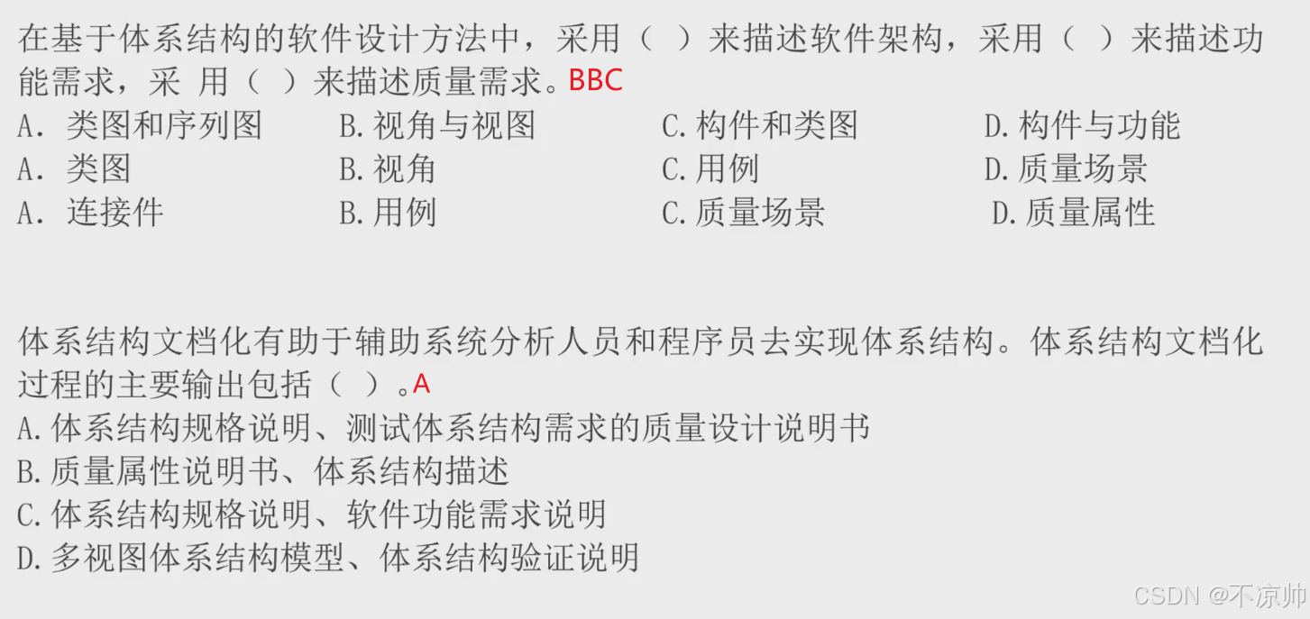 ✔ 基于体系结构(架构)的软件设计(Architecture-Based Software Design,ABSD)方法。ABSD方法是体系结构驱动,即指构成体系结构的商业 、质量和功能需求的组合驱动的。在基于体系结构的软件设计方法中,采用视角与视图来描述软件架构,采用用例来描述功能需求,采用质量场景来描述质量需求。