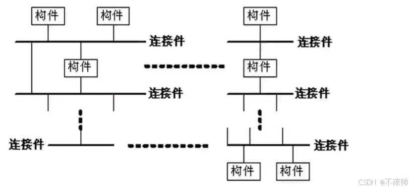 ✔ SA的基本概念,即SA模型由哪些元素组成,这些组成元素之间按照何种原则组织。传统的设计概念只包括构件(软件系统中相对独立的有机组成部分,最初称为模块)以及一些基本的模块互联机制。随着研究的深入,构件间的互联机制逐渐独立出来,成为与构件同等级别的实体,称为 连接子。