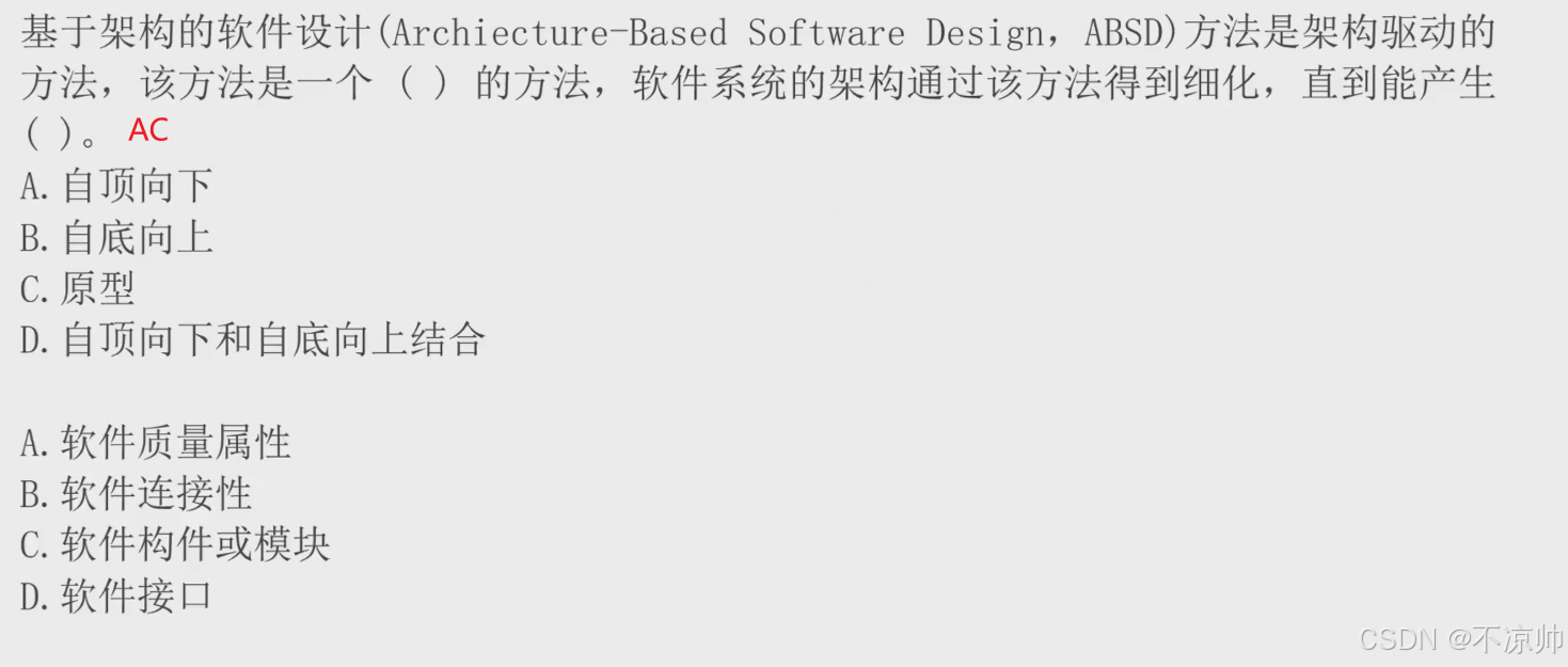 ✔ ABSD方法是一个自顶向下 ,递归细化的方法,软件系统的体系结构通过该方法得到细化,直到能产生软件构件和类。