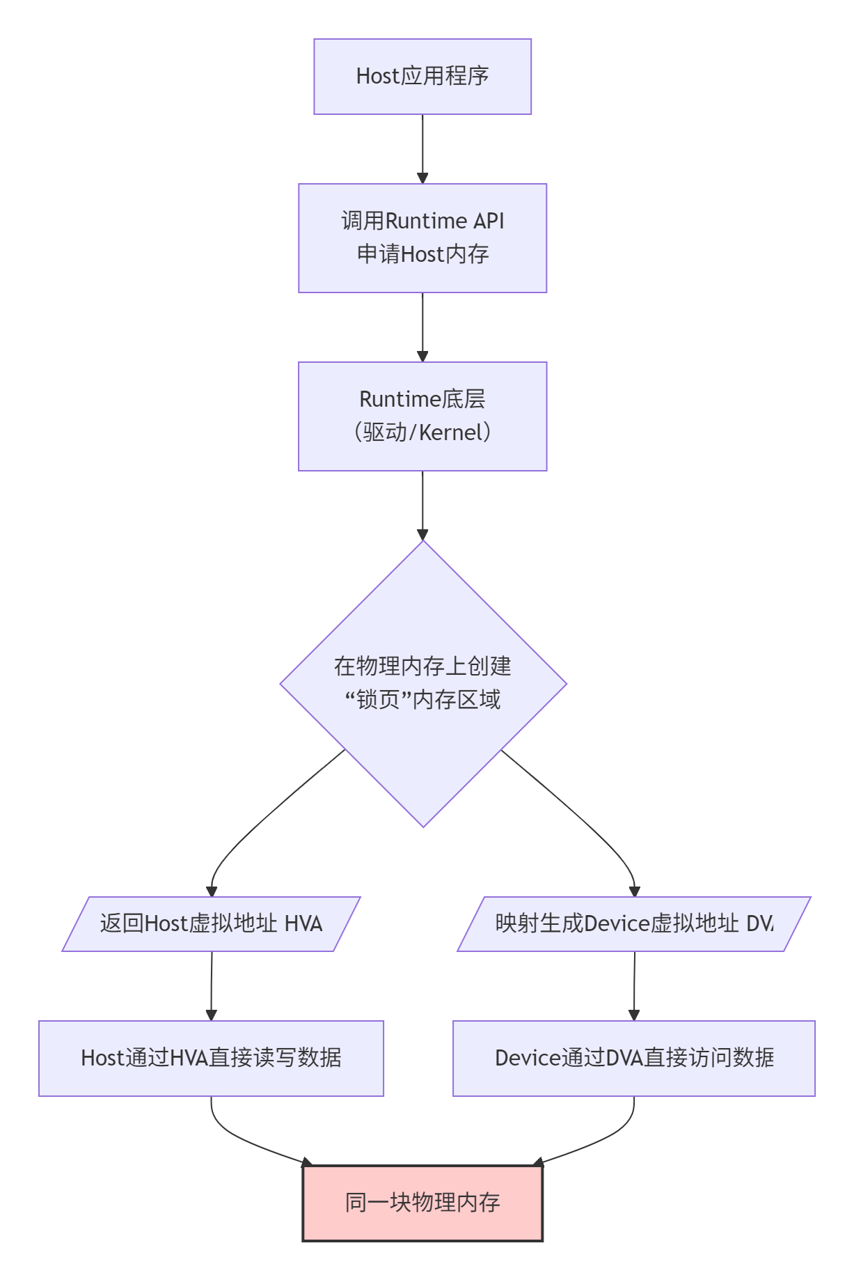 地址映射:它为这块物理内存同时建立了Host侧的虚拟地址(HVA)和Device侧的虚拟地址(DVA)。这样,两边的处理器就能通过各自的页表,正确地找到并访问同一块"宝地"。