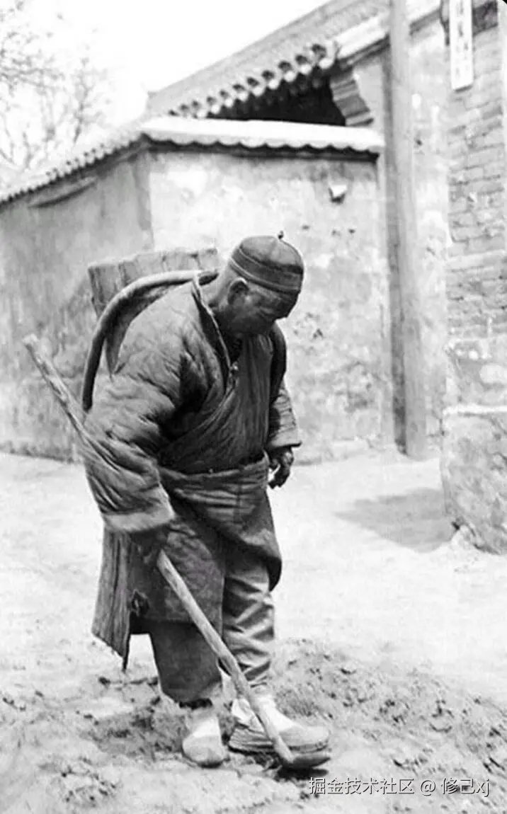 今天在滑看手机时,一张九十年代的老照片忽然映入眼帘:一位穿着粗布衣裳的老人,背着一只粪筐,正弯着腰在路上拾粪。这一幕像一把沉默的钥匙,"咔哒"一声,轻轻旋开了我记忆的闸门------我又回到了童年那个黄土坡上的小村庄。