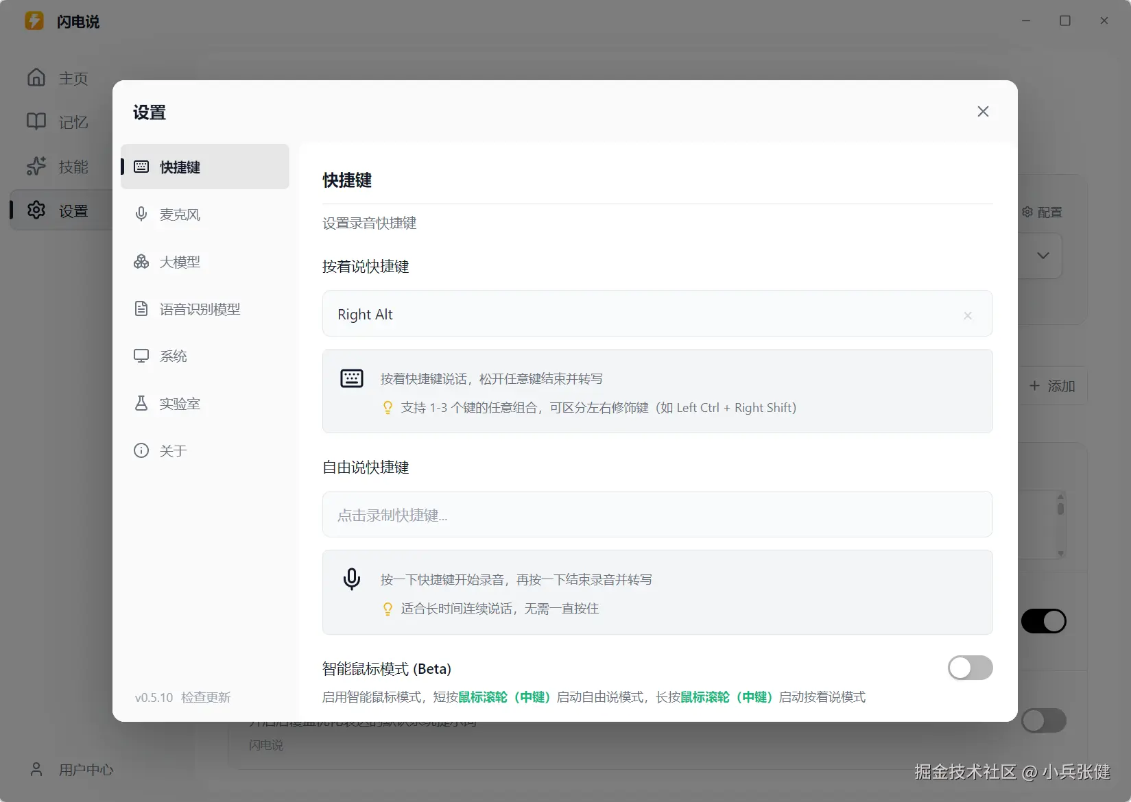 首先是 闪电说,AI语音输入法,用这个的核心原因是中国开发的,体验比较好,本地模型 800M 左右,RAM 占用不大,识别效果还可以,自带标点符号,还可以很方便的切换线上大模型。