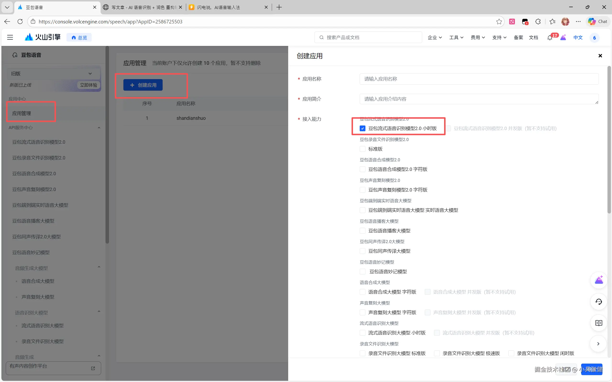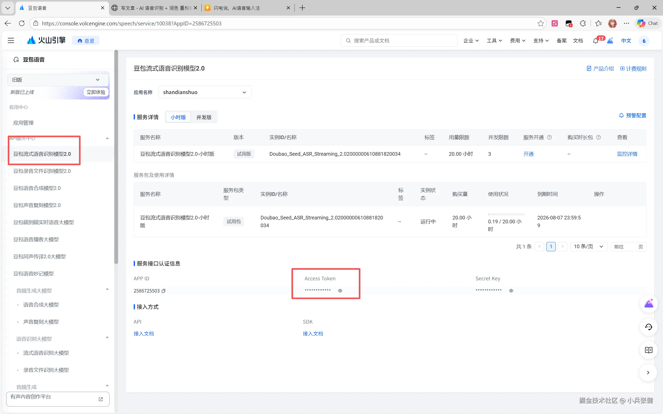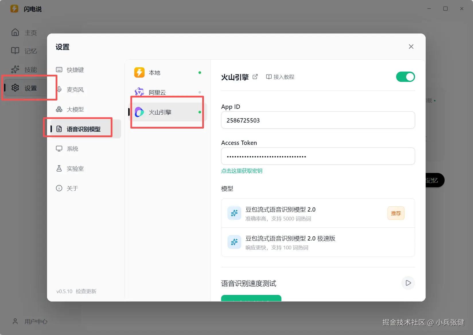 如果觉得本地的模型识别率不够,可以换成线上的,这边的创始人推荐用 豆包流式语音识别模型2.0。我试了下效果还可以,新用户有 20 个小时的免费额度。