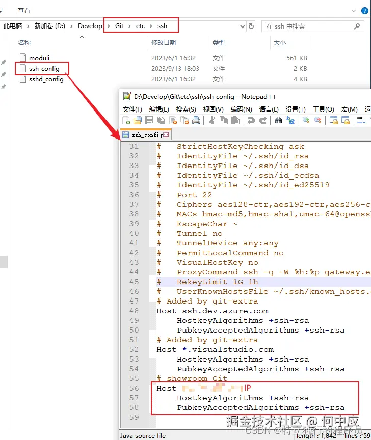 好了,以上配置后,使用SSH链接克隆代码报最开始的错误,==需要找到Git安装目录下的ssh_config配置,在配置的最末尾加上这段配置==,其中==模糊的部分是远程仓库的IP地址,不加端口号,不要手敲,复制前面的==;