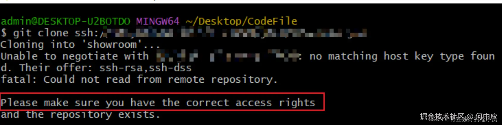 说明:配置了SSH秘钥后,使用SSH地址克隆代码,依旧无法拉取代码,提示下面这个信息。 Their offer:ssh-rsa,ssh-dss fatal:Could not read from remote repository. Please make sure you have the correct access rights and the repository exists.