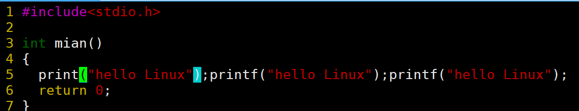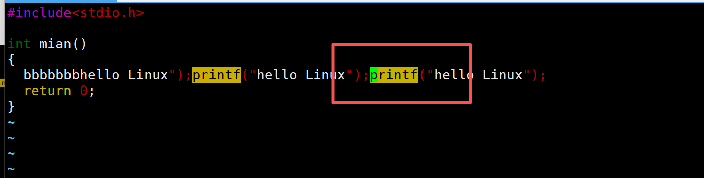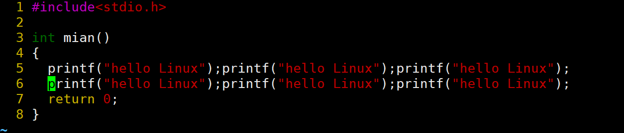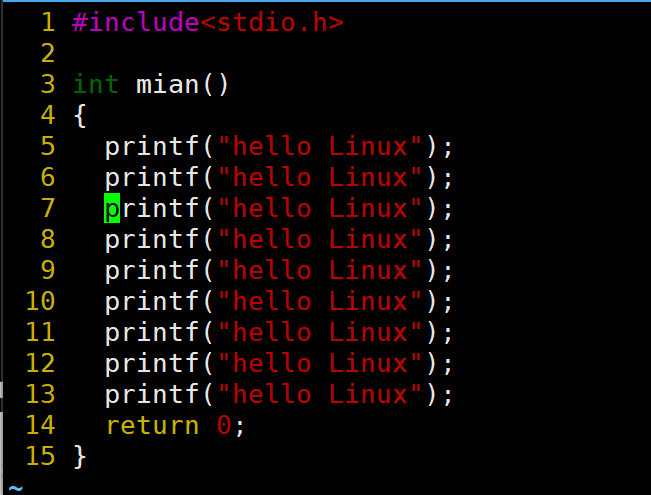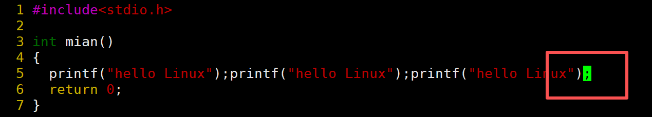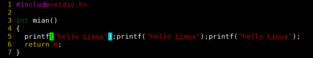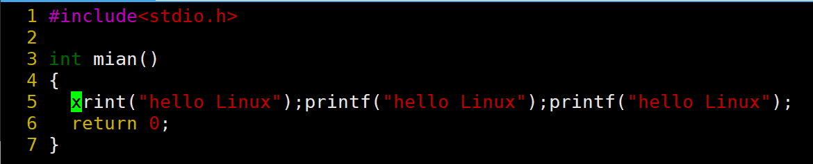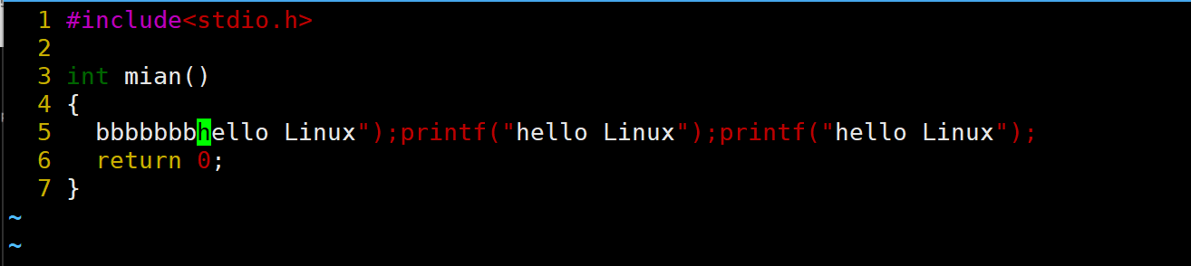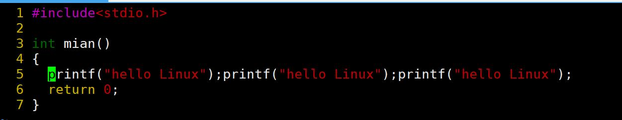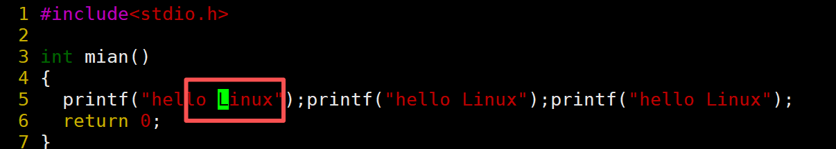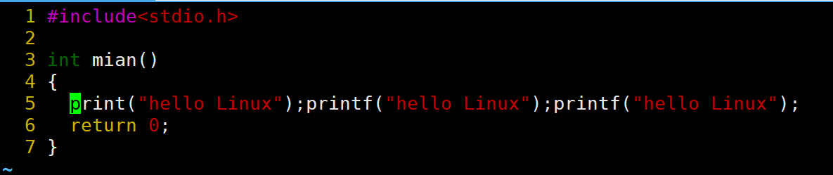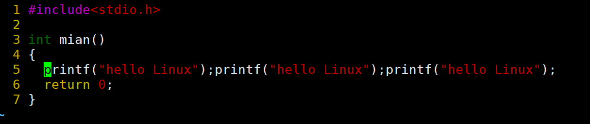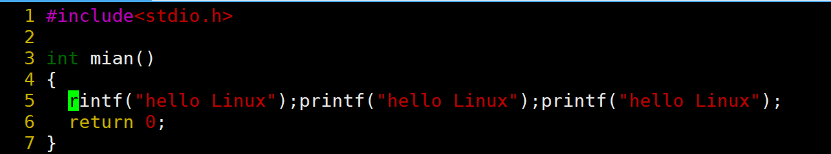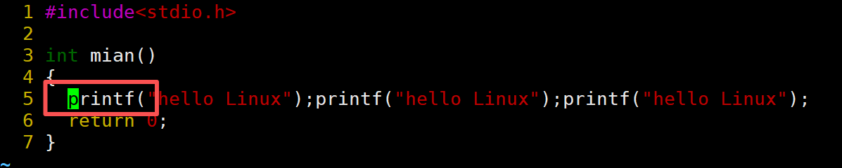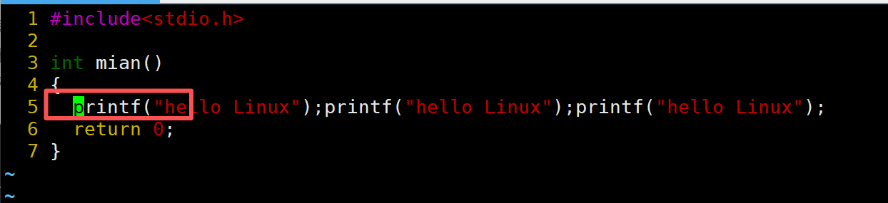 当前光标在第7行的开头,假设现在要把光标移动到第7行里面的第二个printf,使用l键向右移动就要连续按多次才能到第二个printf。比较麻烦,这时候就可以使用w。