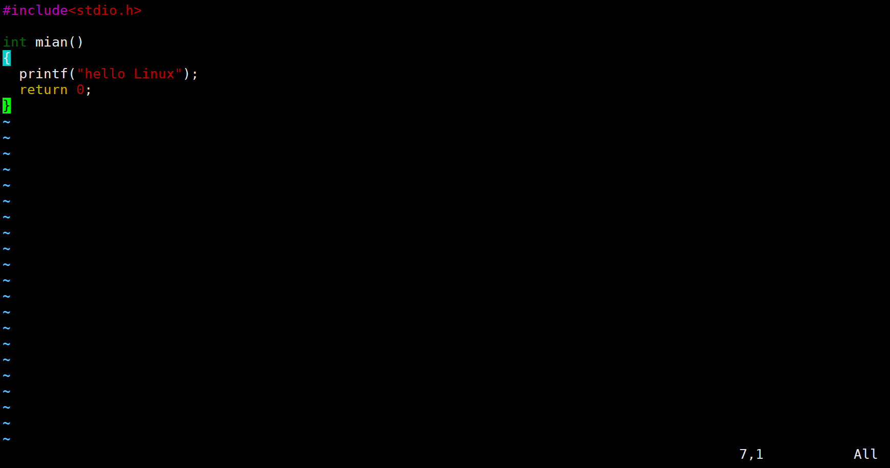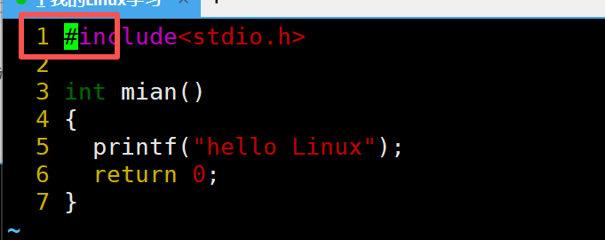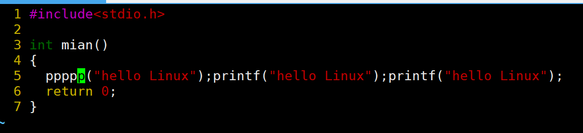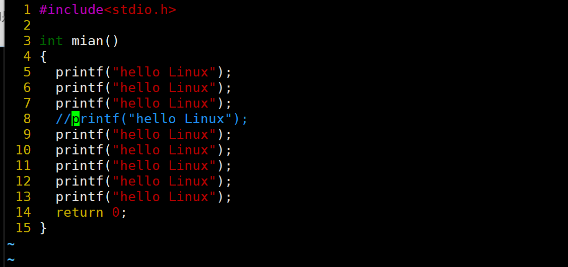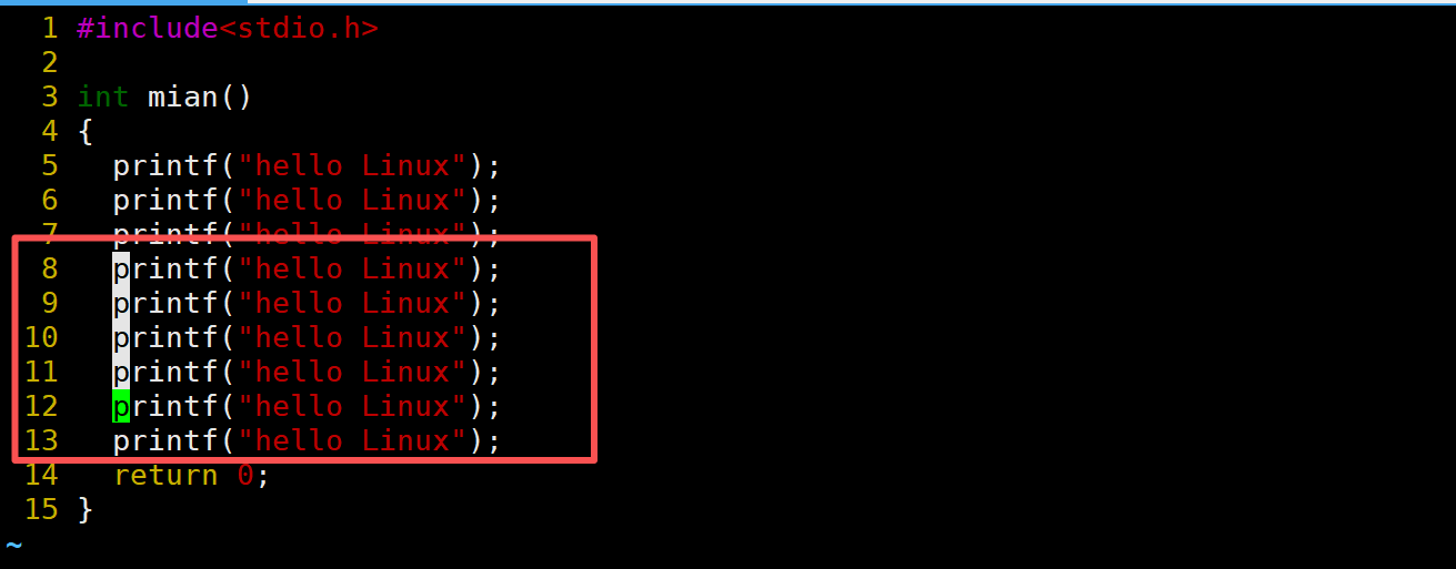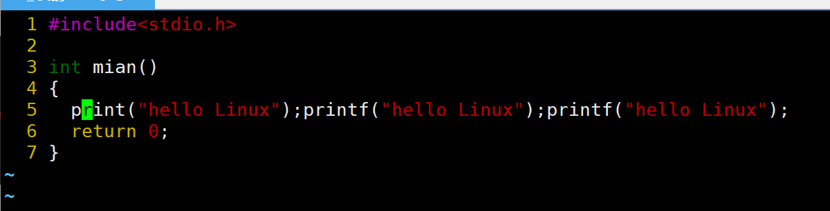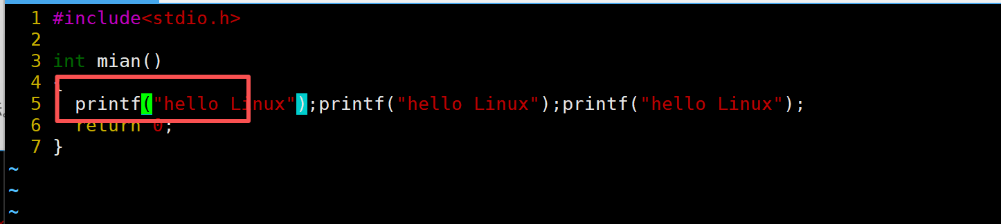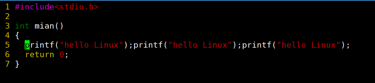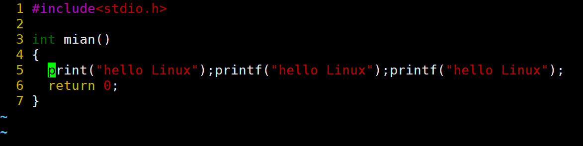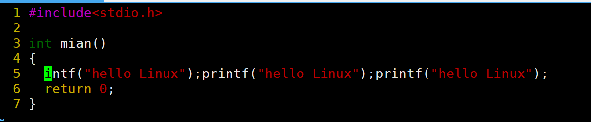 当前光标在第7行的开头,假设现在要把光标移动到第7行里面的第二个printf,使用l键向右移动就要连续按多次才能到第二个printf。比较麻烦,这时候就可以使用w。