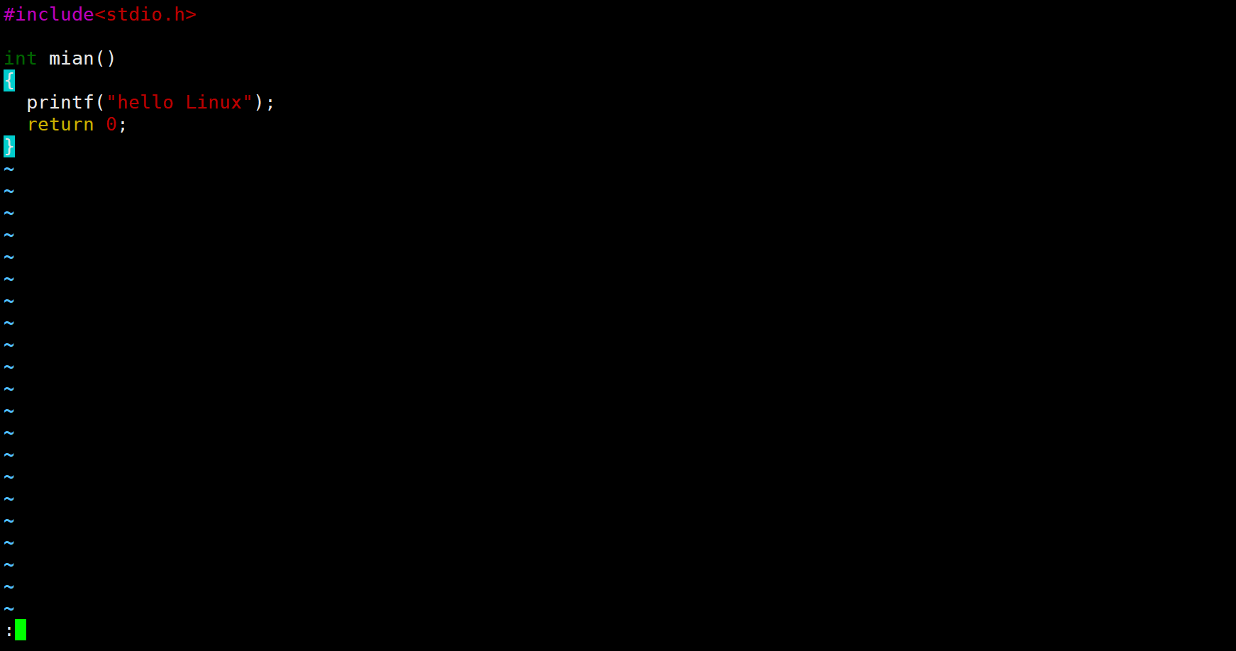 编写完代码后就可以保存退出code.c文件。想要保存这个文件要进入底行模式。想要从命令模式进入底行模式要输入符号 : (shift + 符号 ; = 符号 : )