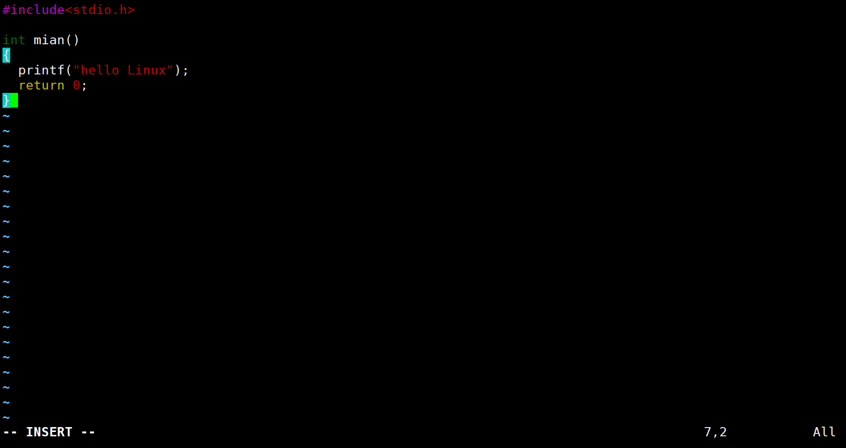 输入 i 之后可以发现左下角有INSERT,现在就处于插入模式。我们就可以开始代码的编写。