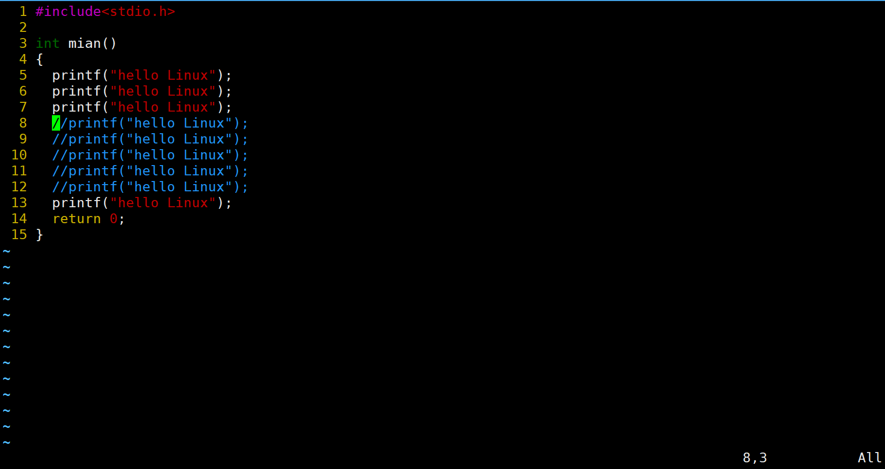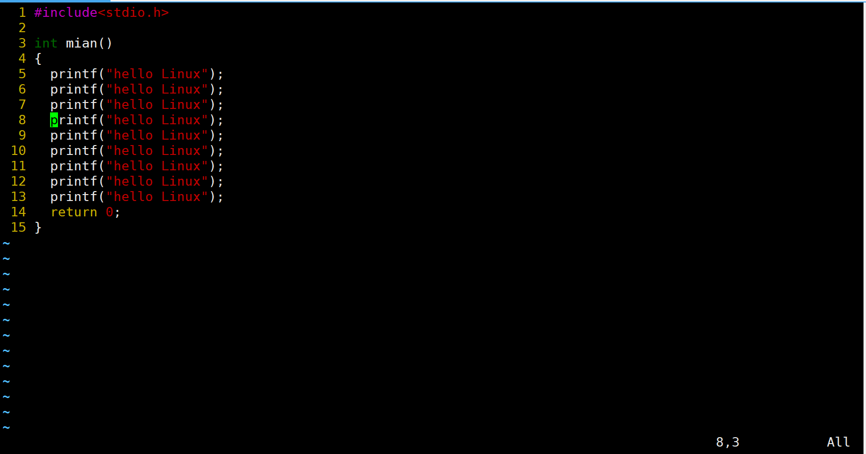先让光标移动到第8行