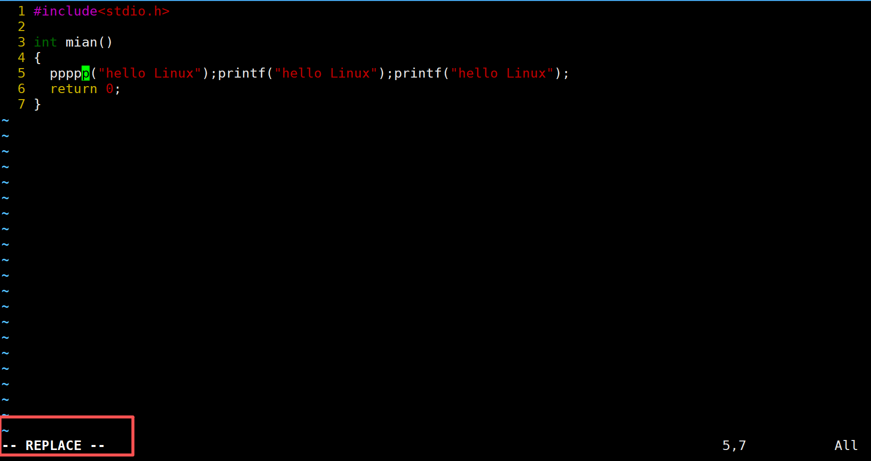 r也可以配合数字使用,现在光标在x这里,如果现在先输入5再输入r,就可以选中当前位置向后4个位置,一共5个位置,然后再输入p,就可以把内容都替换成p,如下图: