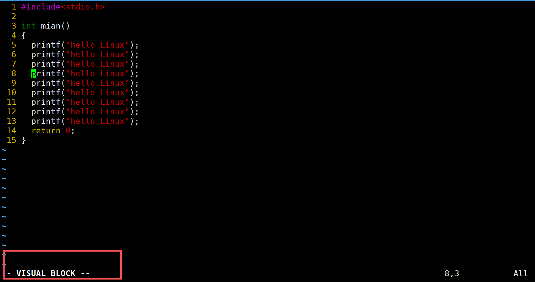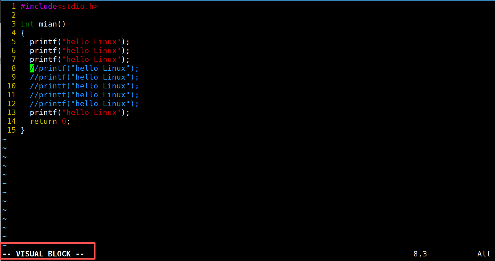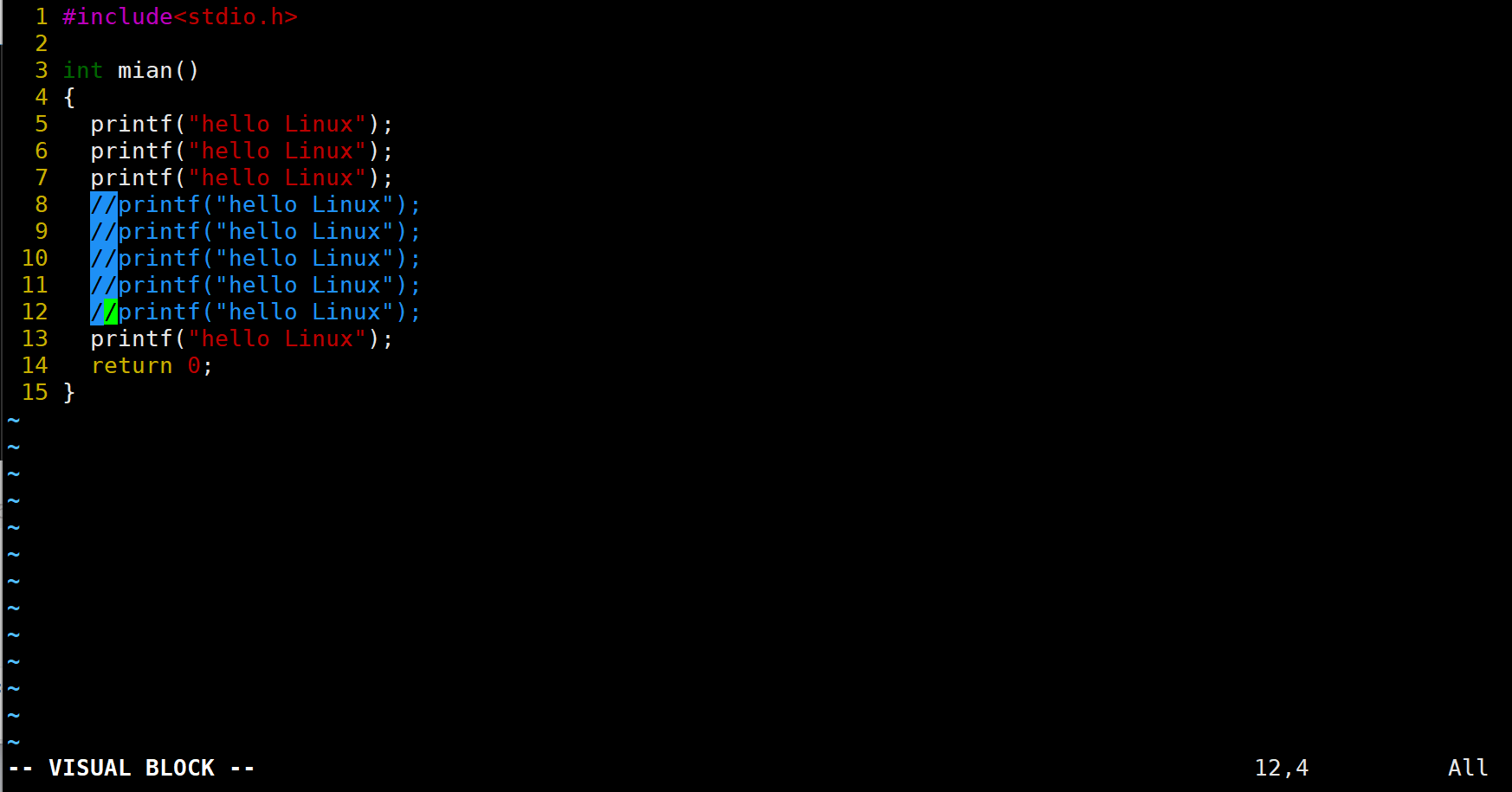 观察左下角发现VISUAL BLOCK,此时从命令模式进入视图模式。通过h、j、k、l来选中要批量操作的范围。现在要注释第8行到12行的内容,使用j来让光标移动到第12行