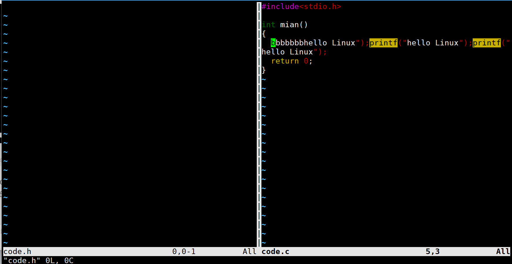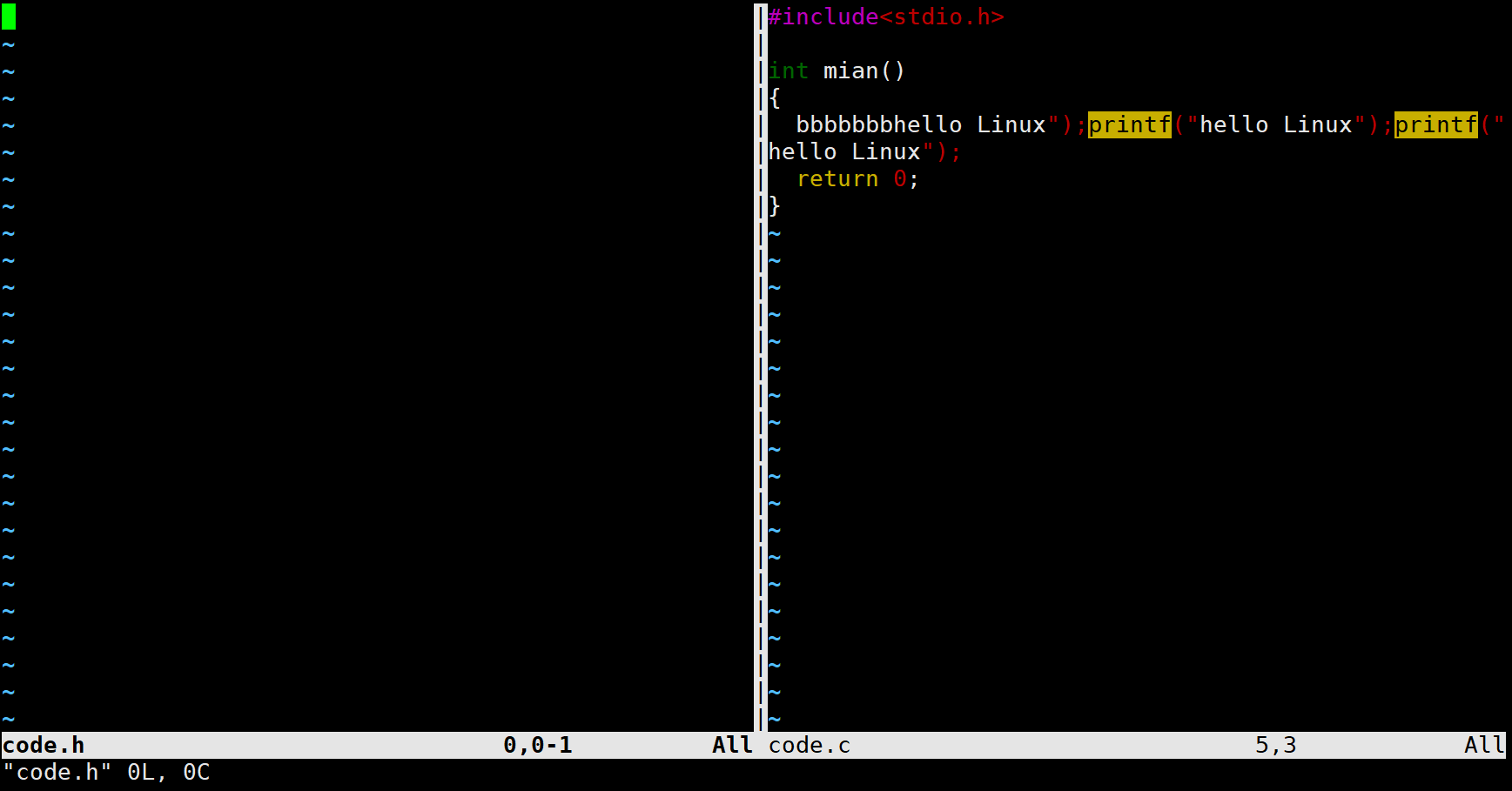 现在还有一个文件code.h,现在用code.c文件的底行模式下输入vs code.h就可以分屏操作。