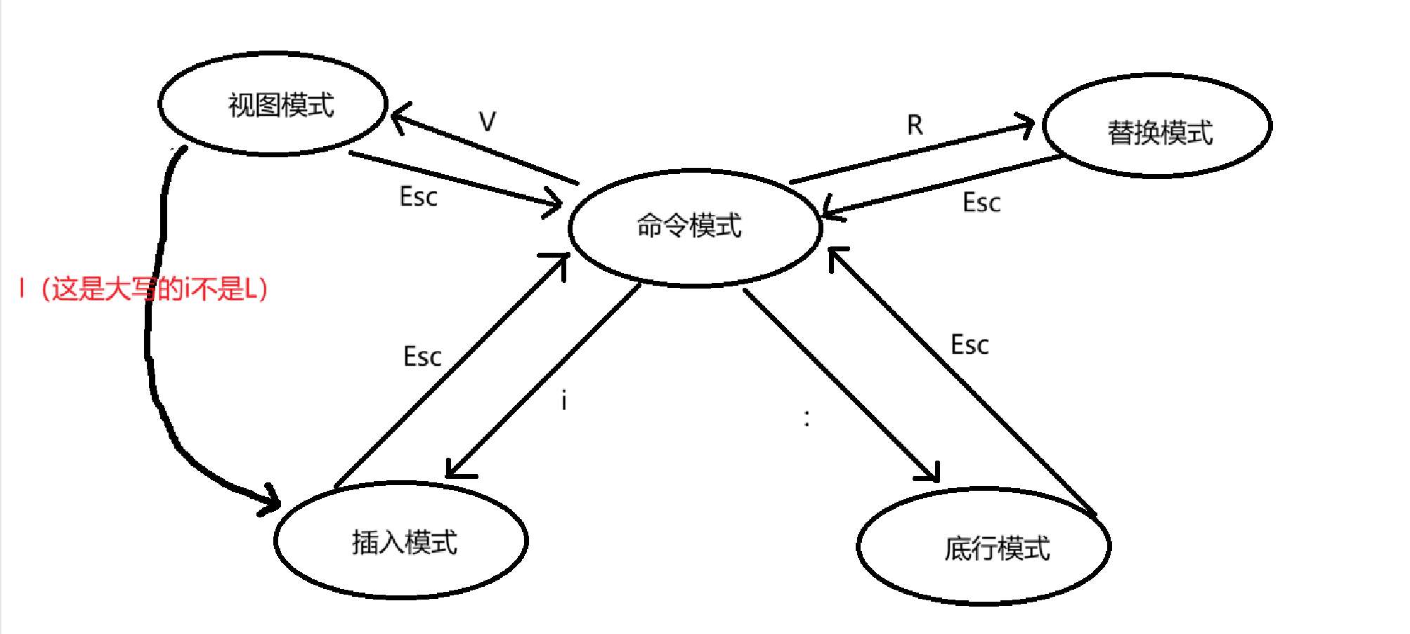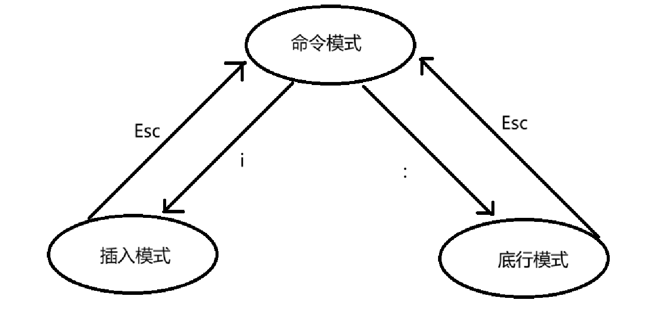 这里需要注意,不能从插入模式直接切换到底行模式,也无法从底行模式直接切换到插入模式。插入模式要切换到底行模式就必须先切换到命令模式,在从命令模式切换到底行模式。底行模式切换到插入模式同理。