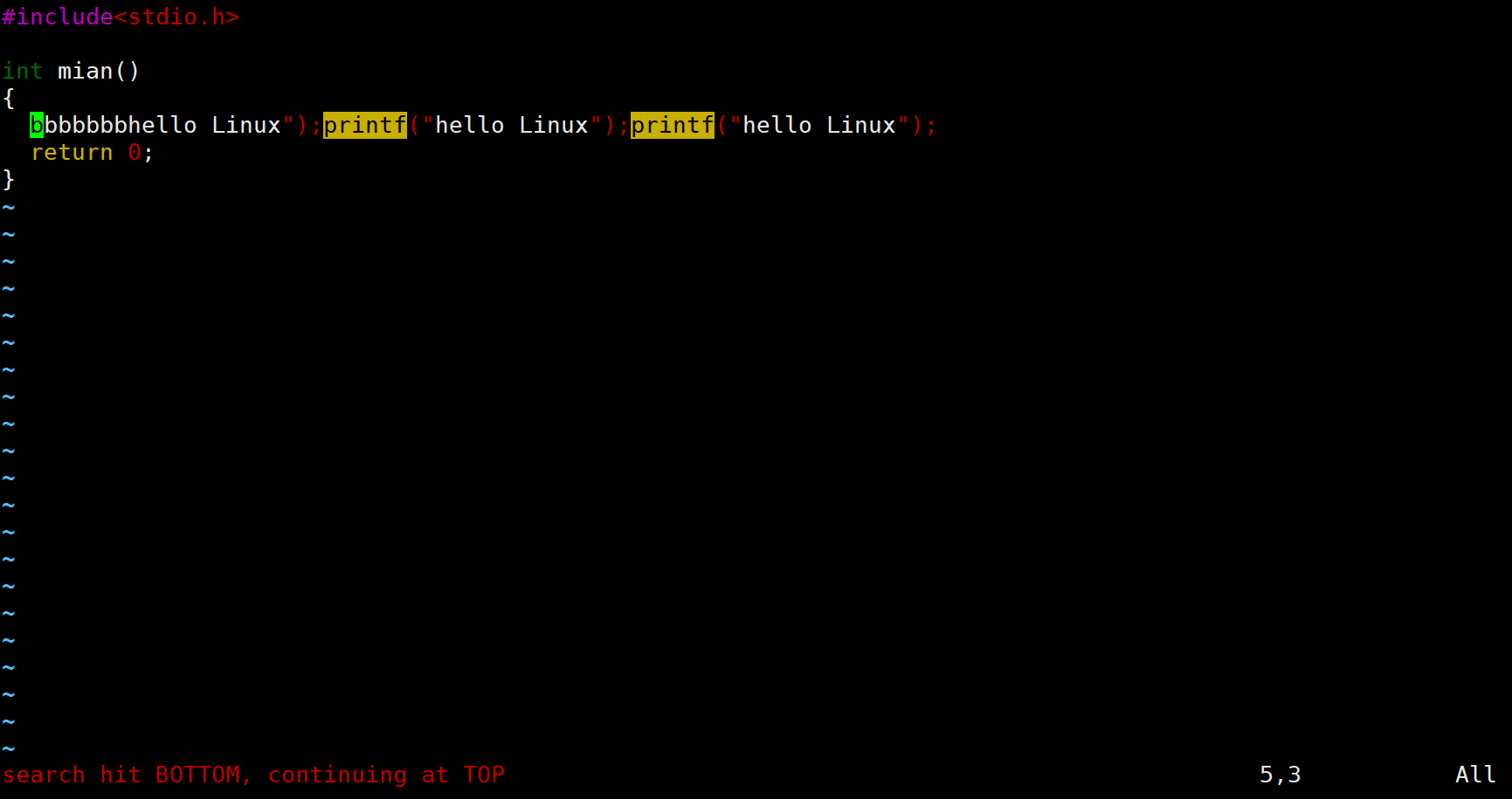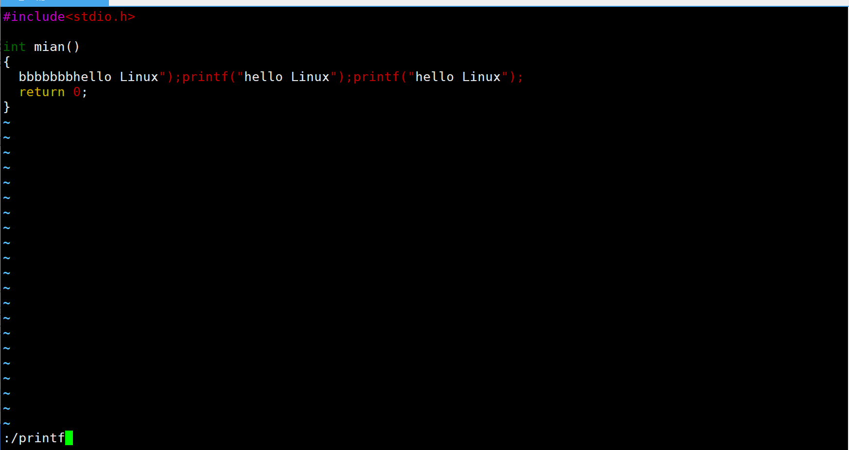 /输入内容:在底行模式下,输入斜杠/然后在斜杠的后面输入内容,会定位到有你输入内容的行的位置。比如现在输入/printf,效果如下: