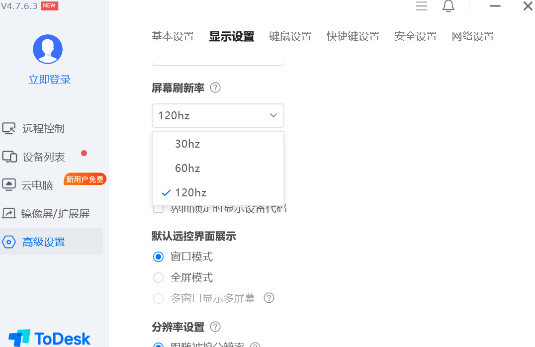 ToDesk: 整体画面清晰度与流畅度略逊于网易 UU 远程,免费版下画面仅能达到常规高清水准,帧率稳定在 60Hz 左右,无额外高帧 / 增强显示选项,观感相对保守。