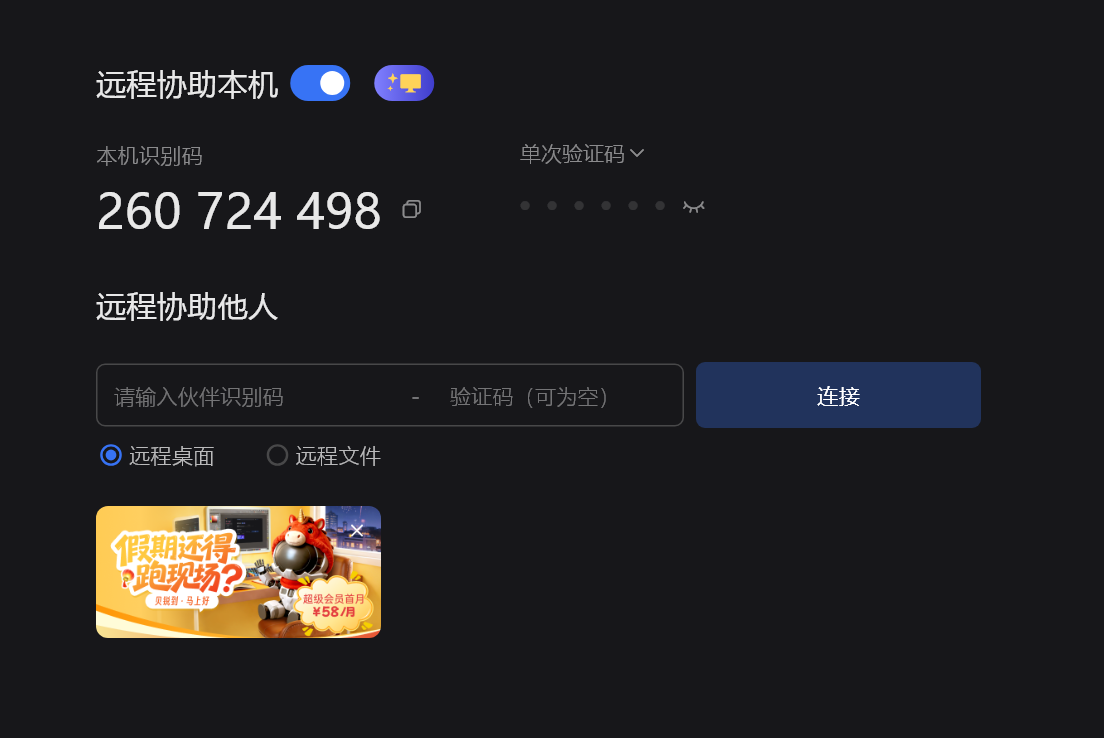 UU远程依旧极简 , 连接流程采用识别码 + 验证码的轻量化方案,一步即可建立远程连接 ,对新手非常友好,极大降低了上手门槛,给我的感觉就是非常轻量化,但因为选择这种方案的实现,给我的感觉就是快,点进去就是桌面,非常具有实时感,在办公方面,非常高效好用