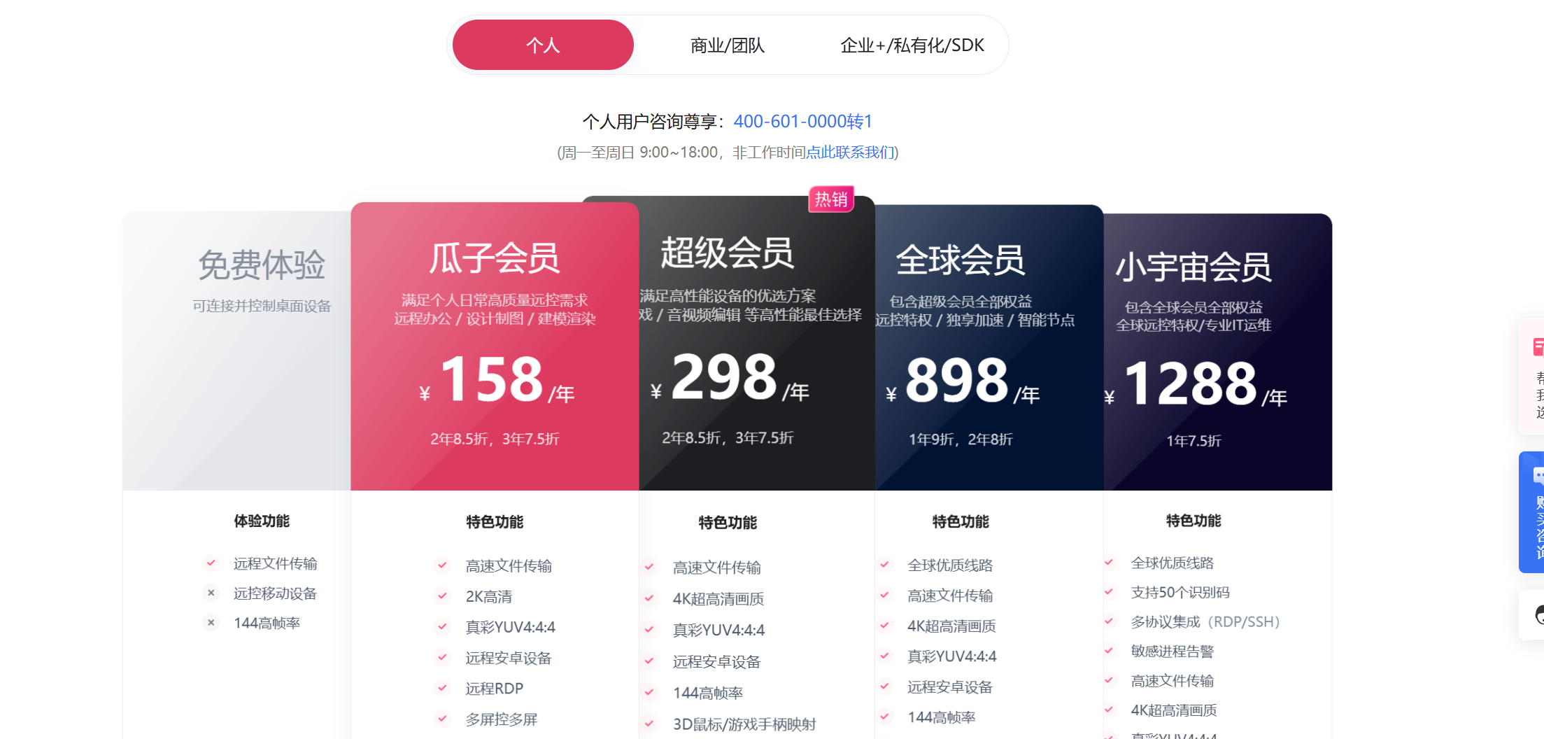 | 向日葵 | 基础远控,高清画质、30 帧上限、基础文件传输、设备列表管理 | 瓜子会员:158 元;超级会员:298 元;全球会员:898 元;小宇宙会员:1288 元向日葵 | 瓜子会员:2K 画质;超级会员:4K/144 帧、游戏手柄映射;高阶会员:全球节点、专业运维功能 | ⭐⭐⭐ |