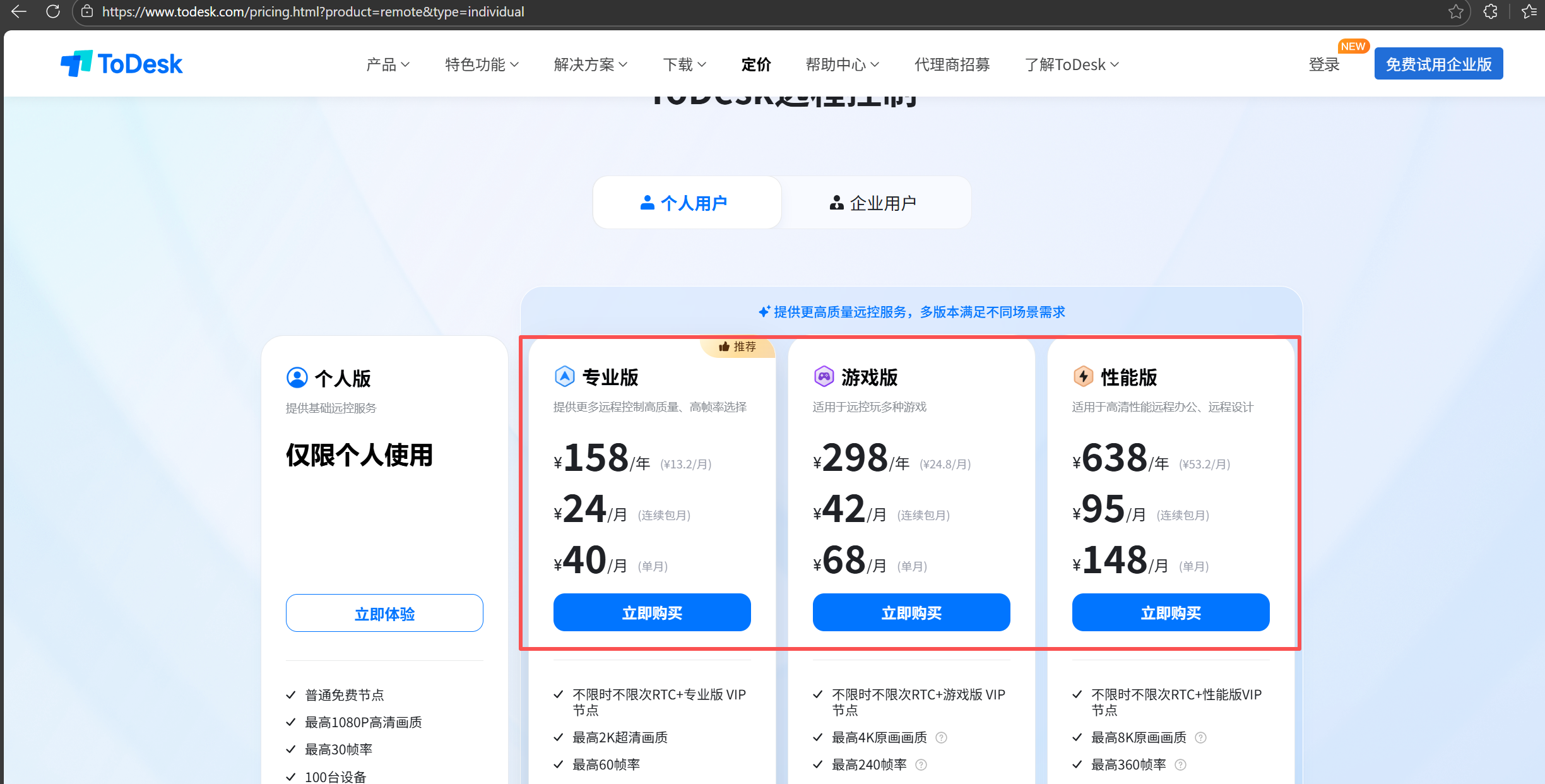 | ToDesk | 基础远控,1080P 画质、30 帧上限、普通节点、100 台设备管理、基础文件传输、隐私屏ToDesk | 专业版:158 元;游戏版:298 元;性能版:638 元 | 专业版:2K/60 帧、VIP 节点、150 台设备;游戏版:4K/240 帧、游戏外设适配、200 台设备;性能版:8K/360 帧、强隐私模式、300 台设备 | ⭐⭐⭐ |
