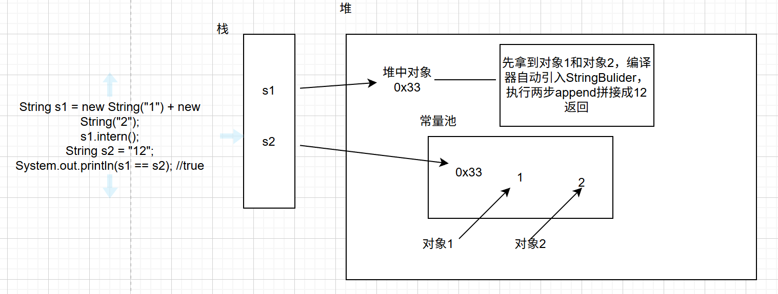 第三种情况是一个陷阱,执行String s1 = new String("1") + new String("2");的时候其实只创建了"1" "2" 两个常量,然后编译器引入了StringBulider实现拼接为12返回,但是常量池中并不存在"12"