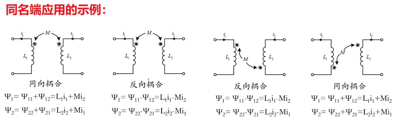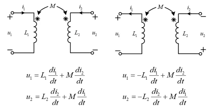 在分析互感电路时,仅知道互感系数 M 还不够,还需要明确互感电压的极性方向,否则无法正确列写电路方程。一般情况下我们是需要通过右手定则判断互感电压的方向、极性的,但是这样太过繁琐,还有可能误判,于是为了工程上的简化,引入了同名端的概念。