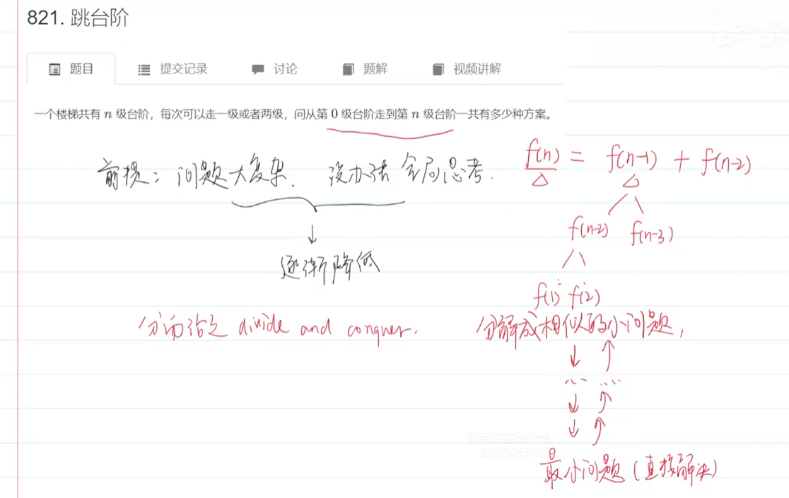 ③不难发现,每一次分解,问题的解决思路是一致的,可以用同样的式子表达出来,最后问题会退化成走0 1 2个台阶有几种方案;
