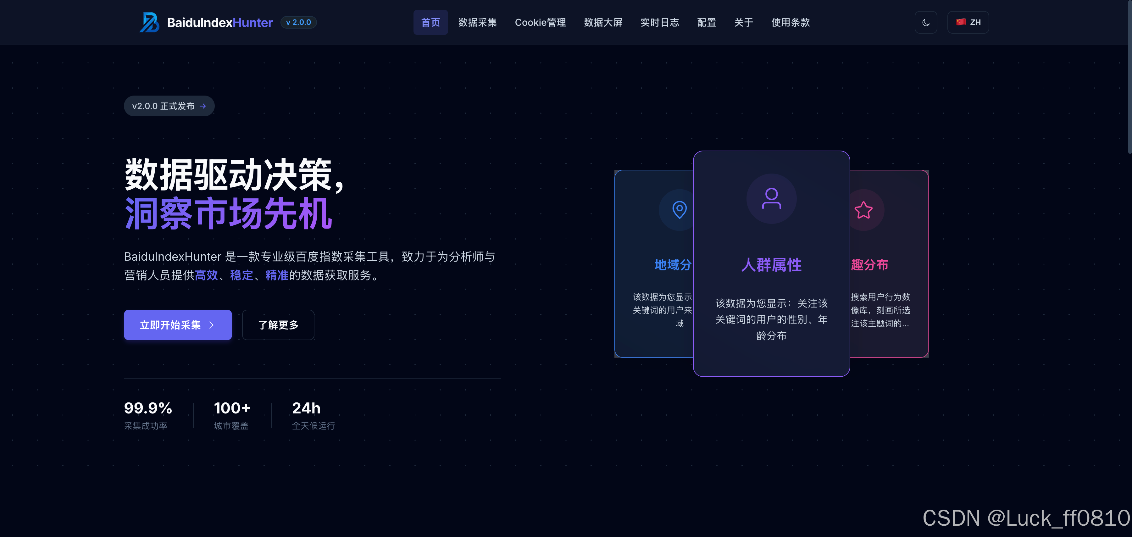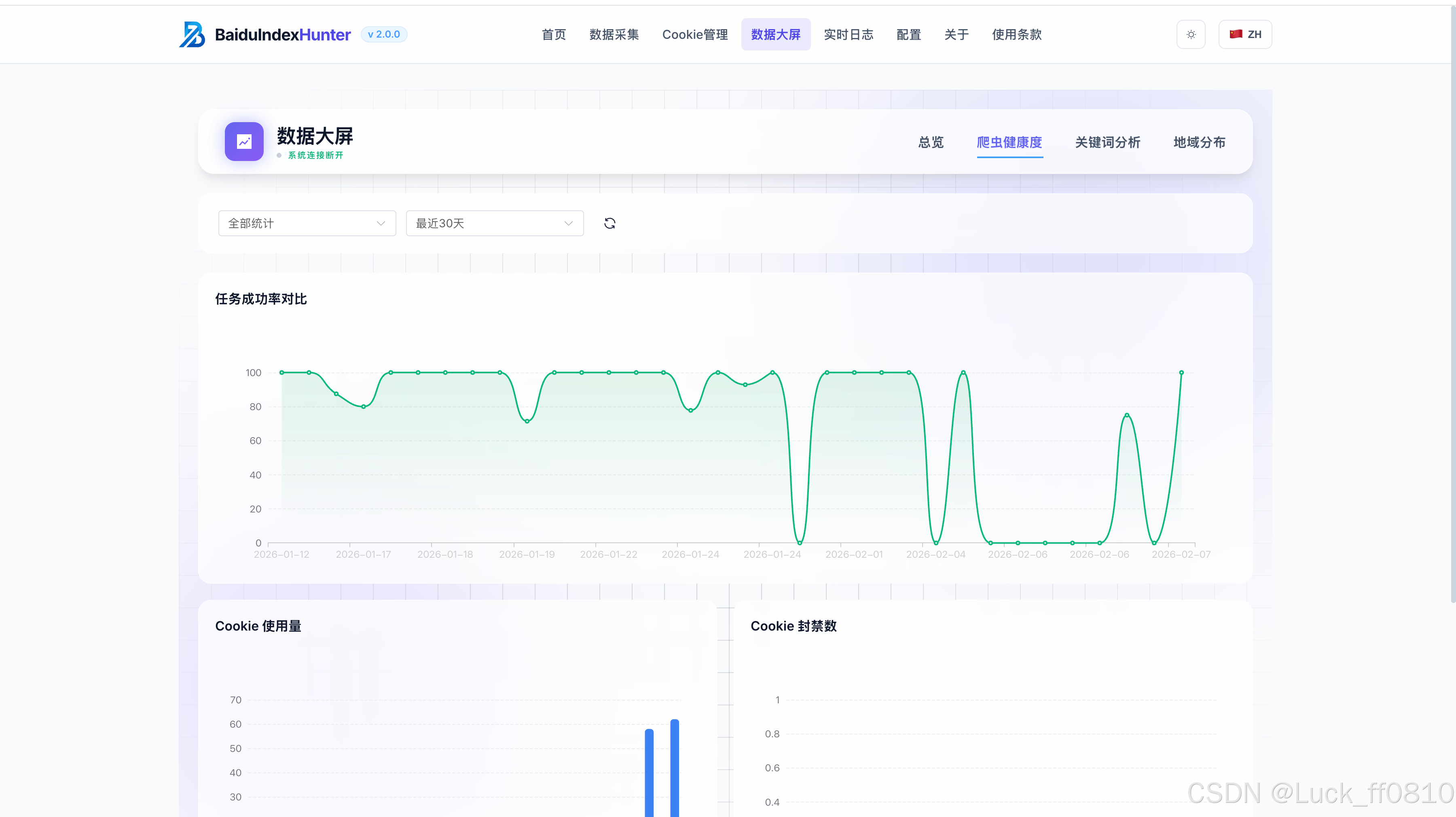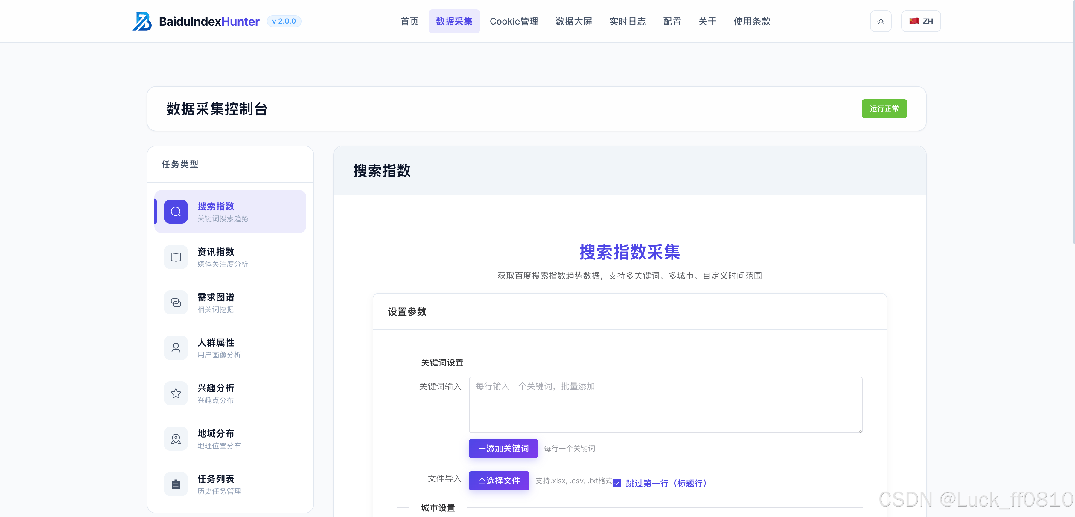 BaiduIndexHunter (百度指数猎人)是一套面向百度指数数据 的采集、存储与可视化平台,采用前后端分离 架构,基于 Flask + Vue 3 + Element Plus 构建。系统支持搜索指数 、资讯指数 、需求图谱 、人群属性 、兴趣分布 、地域分布六大维度数据采集,集成任务调度、Cookie 轮换、断点续爬、实时进度推送与数据大屏等核心能力。