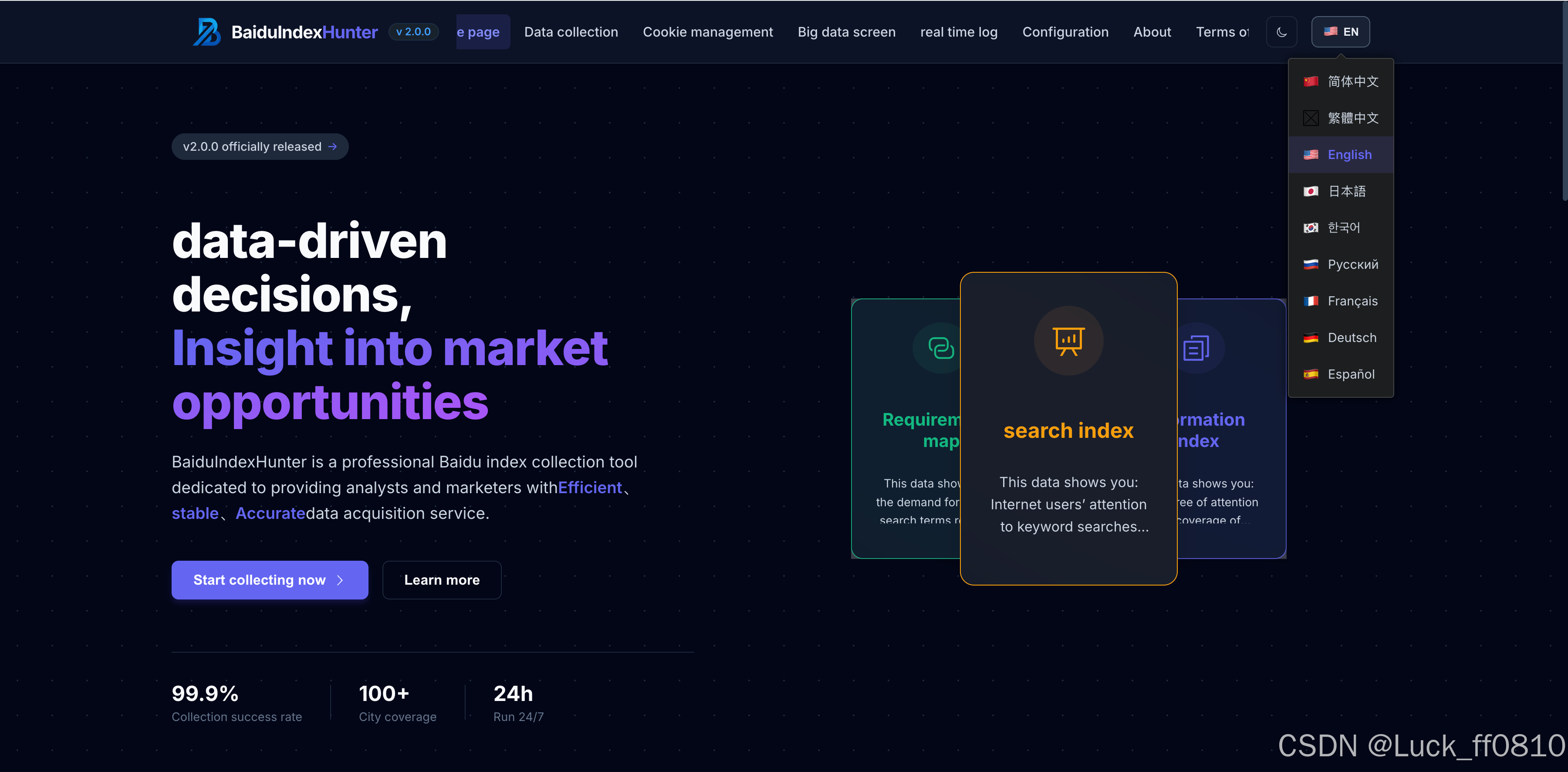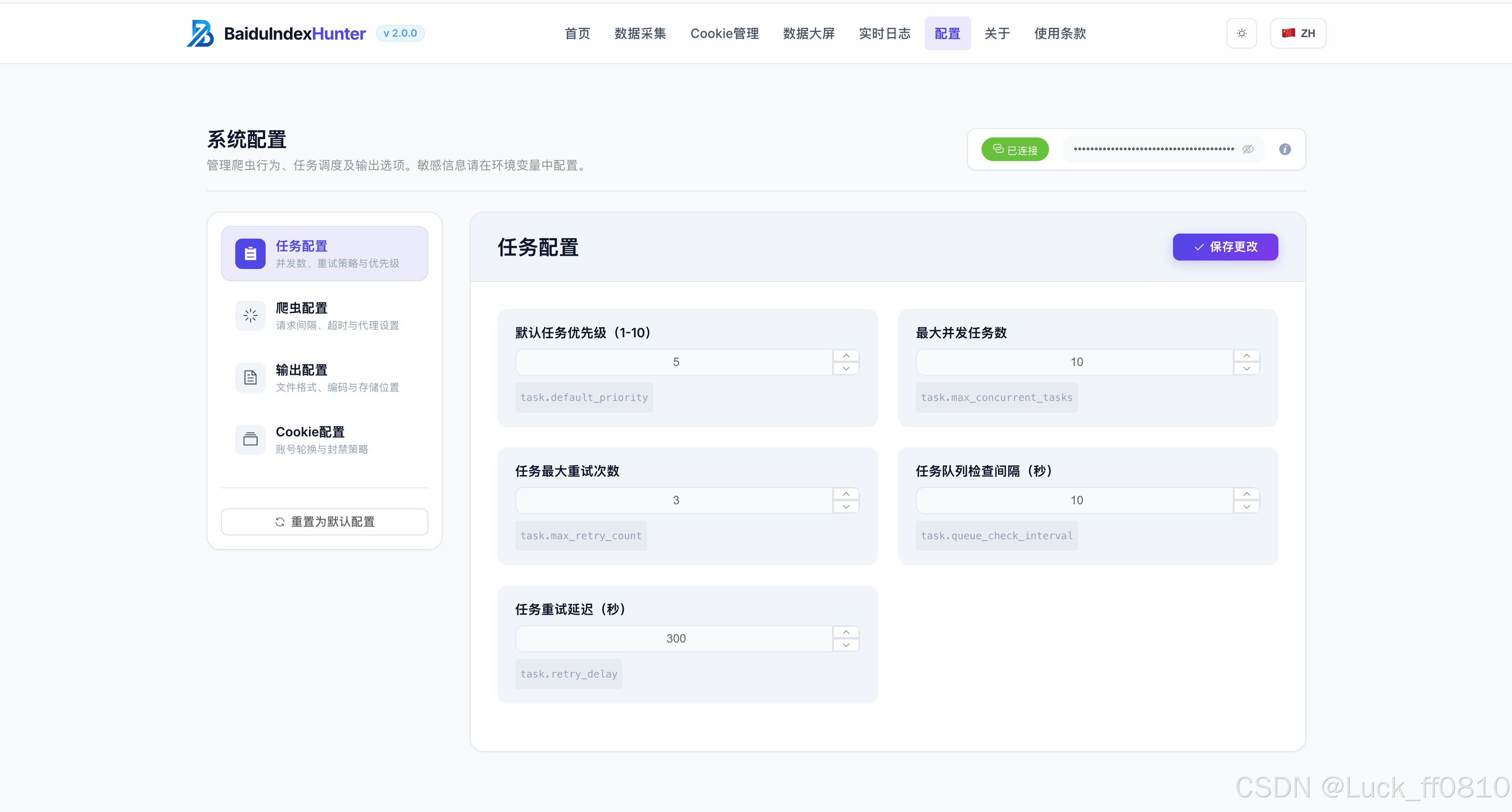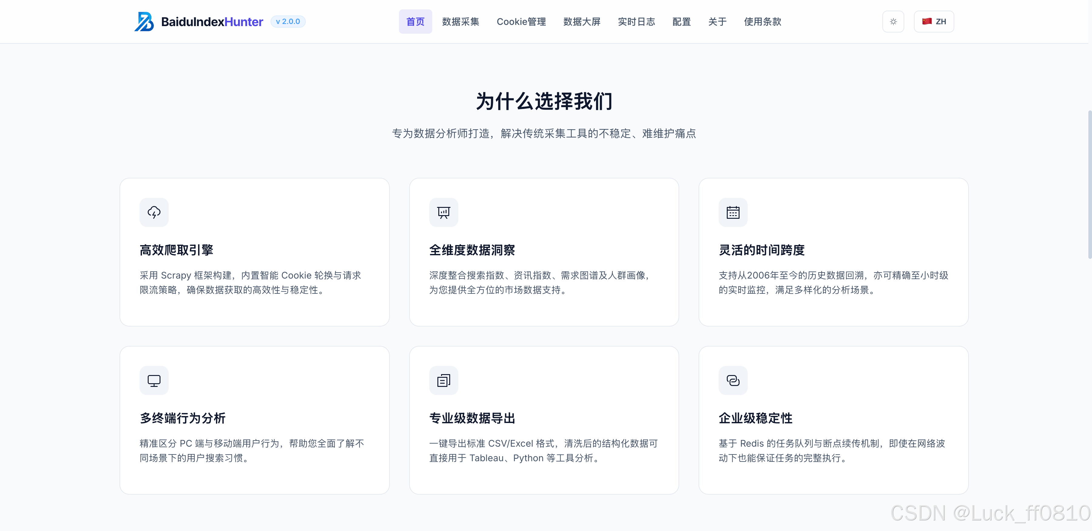 BaiduIndexHunter (百度指数猎人)是一套面向百度指数数据 的采集、存储与可视化平台,采用前后端分离 架构,基于 Flask + Vue 3 + Element Plus 构建。系统支持搜索指数 、资讯指数 、需求图谱 、人群属性 、兴趣分布 、地域分布六大维度数据采集,集成任务调度、Cookie 轮换、断点续爬、实时进度推送与数据大屏等核心能力。