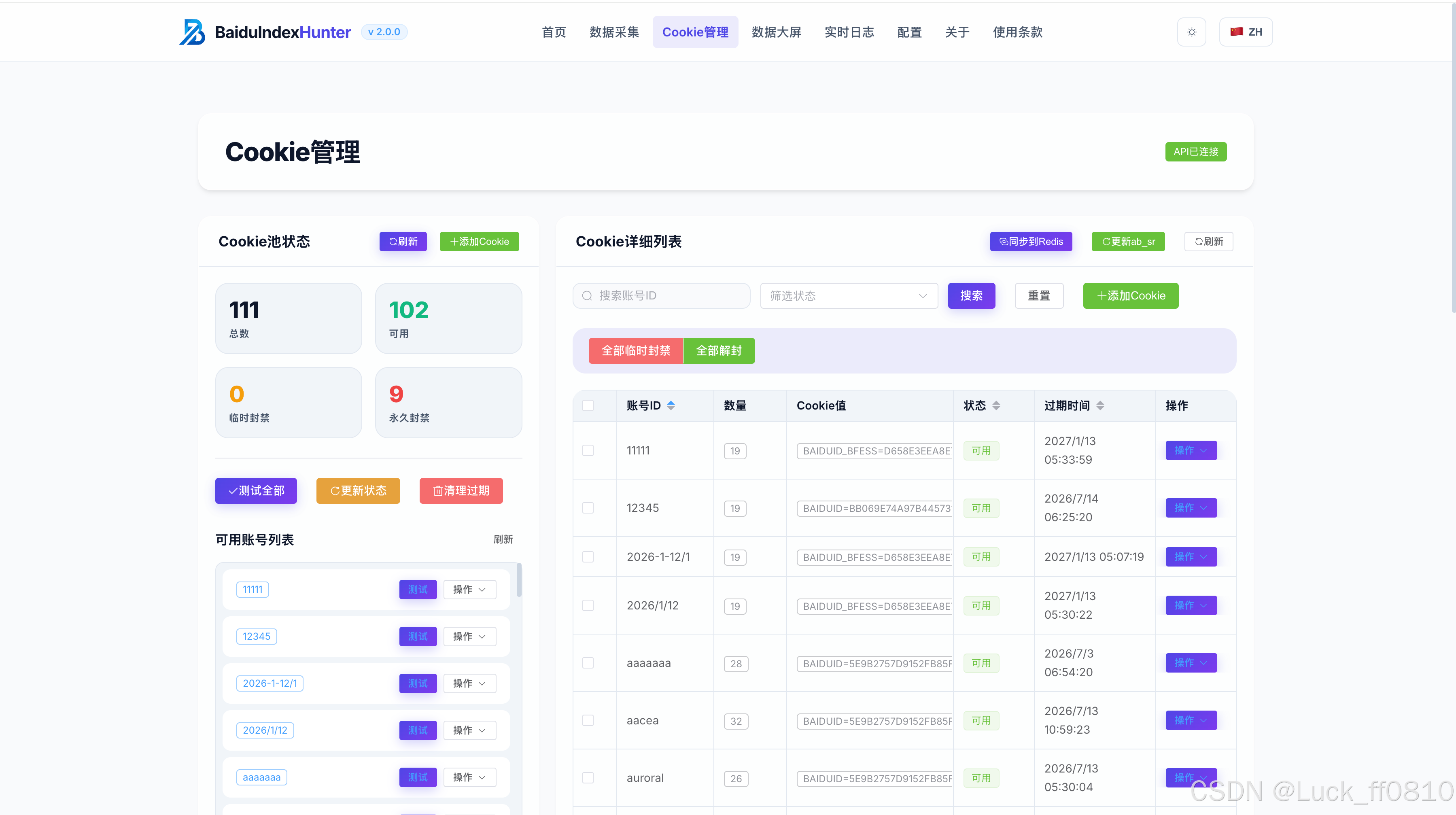 | 4 | 前端 → 「Cookie 管理」→ 添加 Cookie | 能成功添加(需先登录百度指数,从浏览器开发者工具复制 Cookie) |