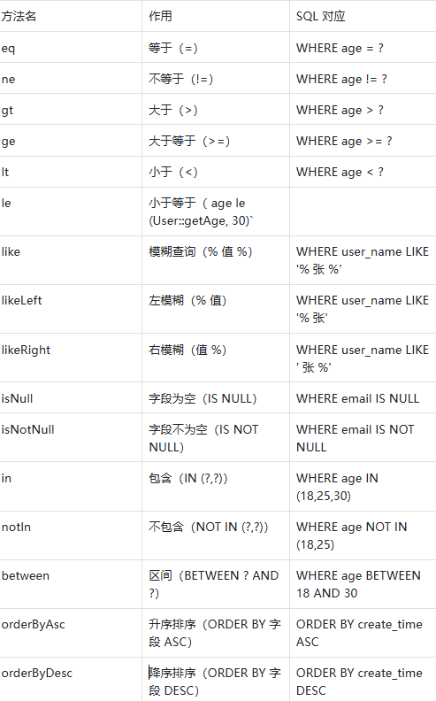 | chain() | 链式调用(高级用法) | userService.chain().like(User::getUserName, "张").list(); |