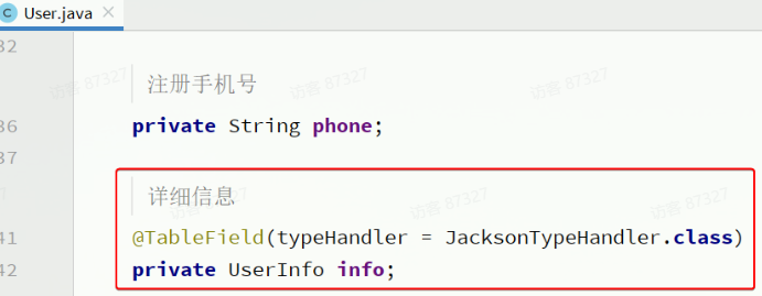 2接下来,将User类的info字段修改为UserInfo类型,并声明类型处理器: