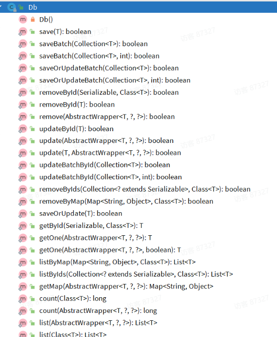 有的时候Service之间也会相互调用,为了避免出现循环依赖问题,MybatisPlus提供一个静态工具类:Db,其中的一些静态方法与IService中方法签名基本一致,也可以帮助我们实现CRUD功能: