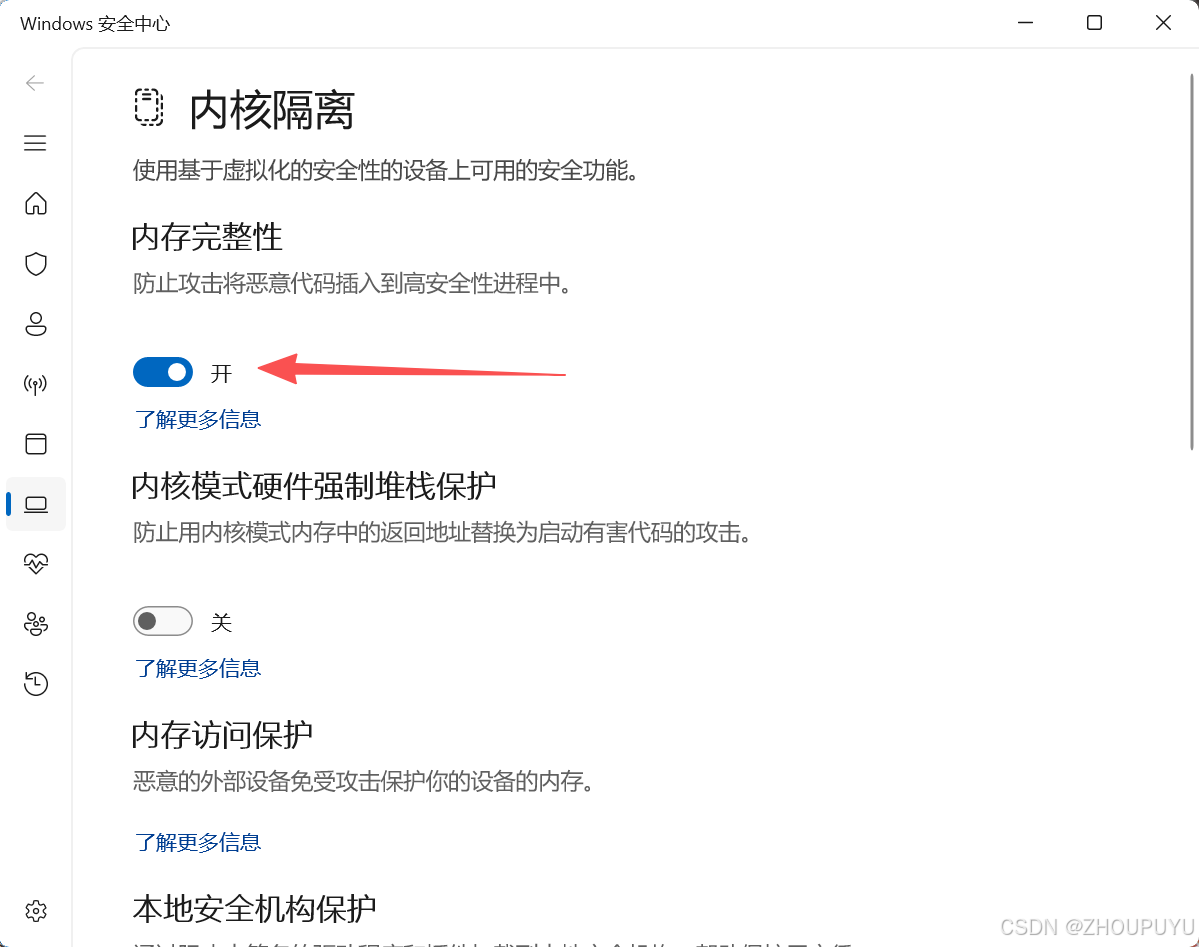 - **潜在的问题:**尽管内存隔离旨在提供额外的安全保护,但它也可能引入一些潜在的问题,例如导致系统崩溃(蓝屏)或出现其他意外情况,所以还是建议关闭。