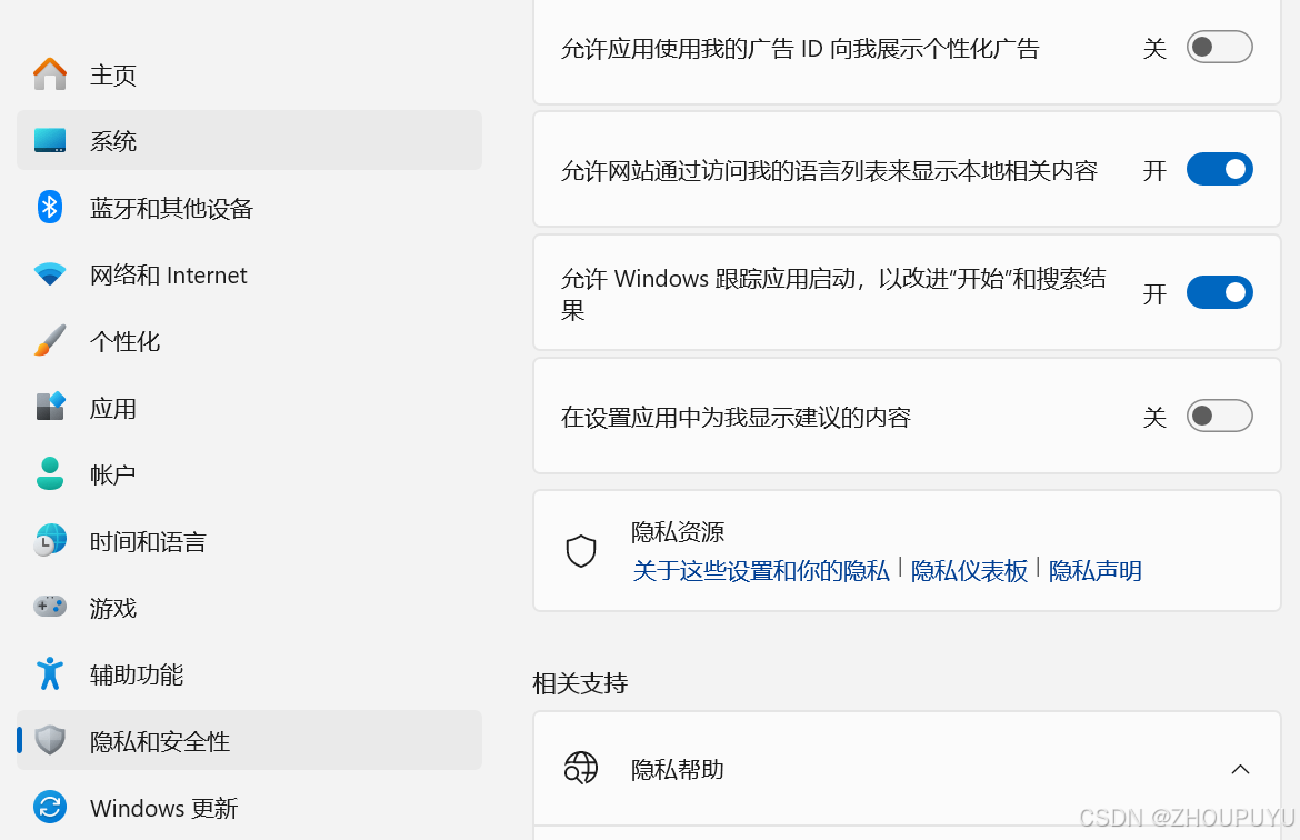 - **在设詈应用中为我显示建议的内容:**注重隐私的用户,建议"关闭"。当你开启此功能时,Windows 会收集你的使用数据,包括你经常使用的应用程序、浏览历史等信息。然后,基于这些数据,Windows 会在设置应用中显示一些建议和提示,例如推荐你可能感兴趣的应用程序、设置或功能,或者提供个性化的设置建议,以提高你的生产力和用户体验。