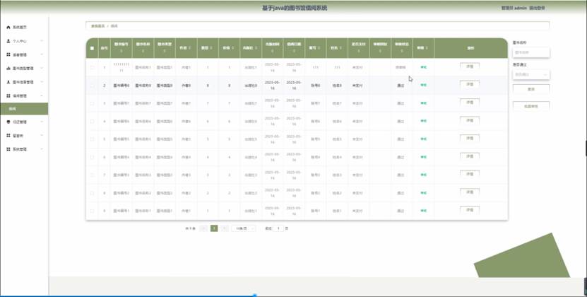管理员点击借阅管理。在借阅页面输入图书名称和选择是否通过进行查询、批量审核借阅列表,并根据需要对借阅详情信息进行详情操作;如图5-10所示: